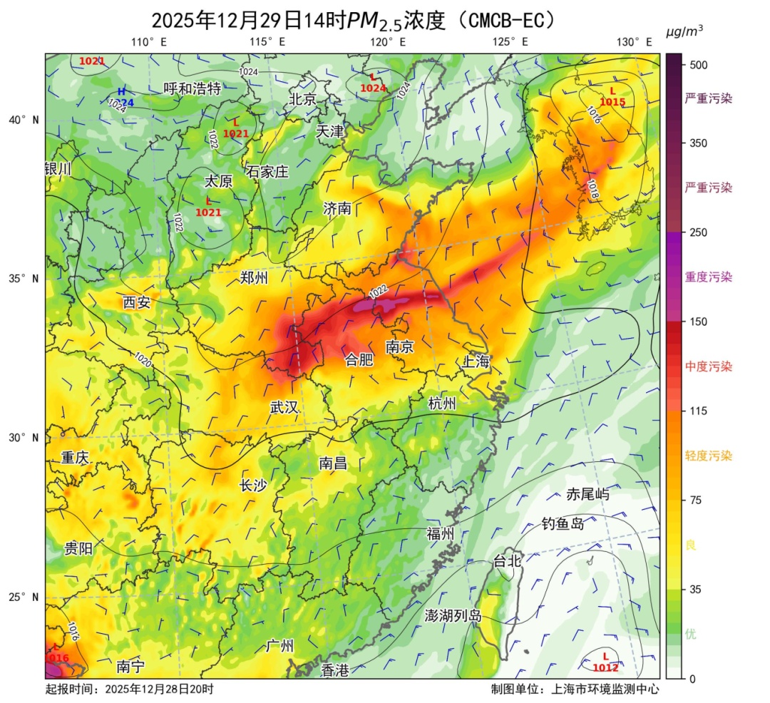 根据最新资料,预计29日白天,本市西南风顺转东北风1~2m/s,受局地累积叠加东北通道污染输送影响,PM2.5浓度逐渐上升,预计29日夜间达到峰值,出现轻度至中度污染过程;30日上午,主导东北风2~3m/s,PM2.5浓度逐渐下降,以良至轻度污染为主,下午风速增大,污染过程结束,空气质量好转为优良水平。