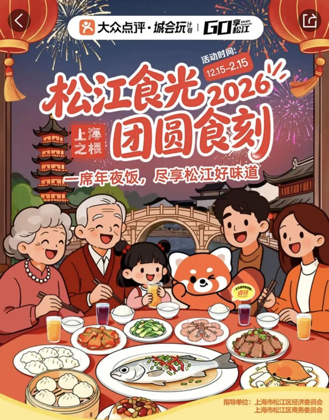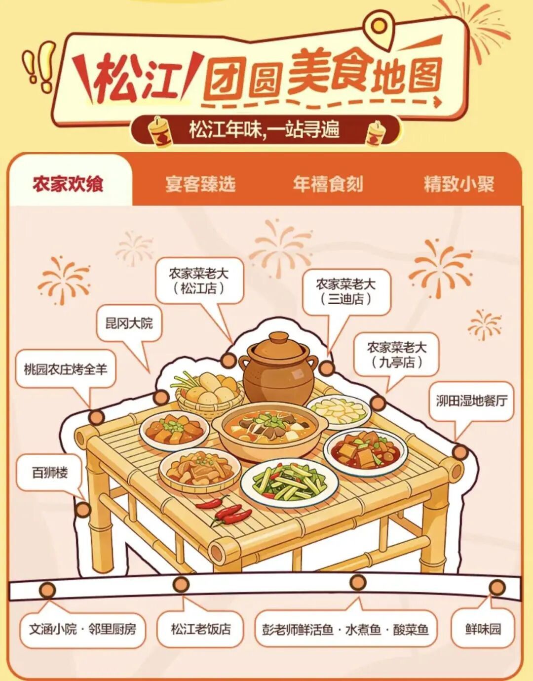 打开专属频道,一份“松江团圆美食地图”映入眼帘。本帮菜拥趸不妨看看竹筷子——这家老字号旗下新松江路店、乐都路店、仓汇路店、鹿都店等多家门店,针对2至10人不同规模家庭聚会,推出“松江稻草扎肉+椒盐基围虾”“小青龙+松叶蟹+河鳗”等招牌组合;江浙风味也不缺席,浙点辣的“波龙小管饭+酱烧黄鱼”12-15人餐、浙里的味道8-12人套餐、小荷谷的“膏蟹+烤鸭+波龙”都颇具特色;讲究“好意头”的食客,全盛记·合州菜、全盛记·合州小海鲜分别推出的“合家锦绣宴”和“祥瑞纳福宴”。