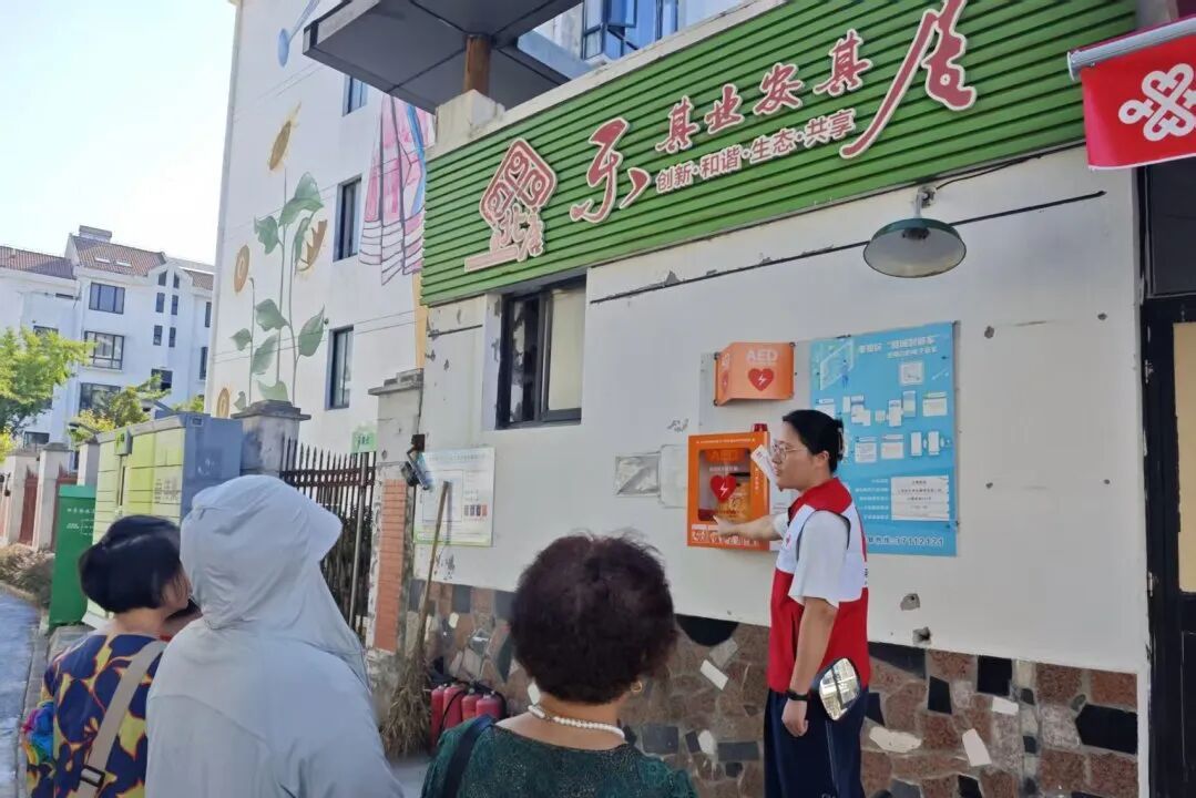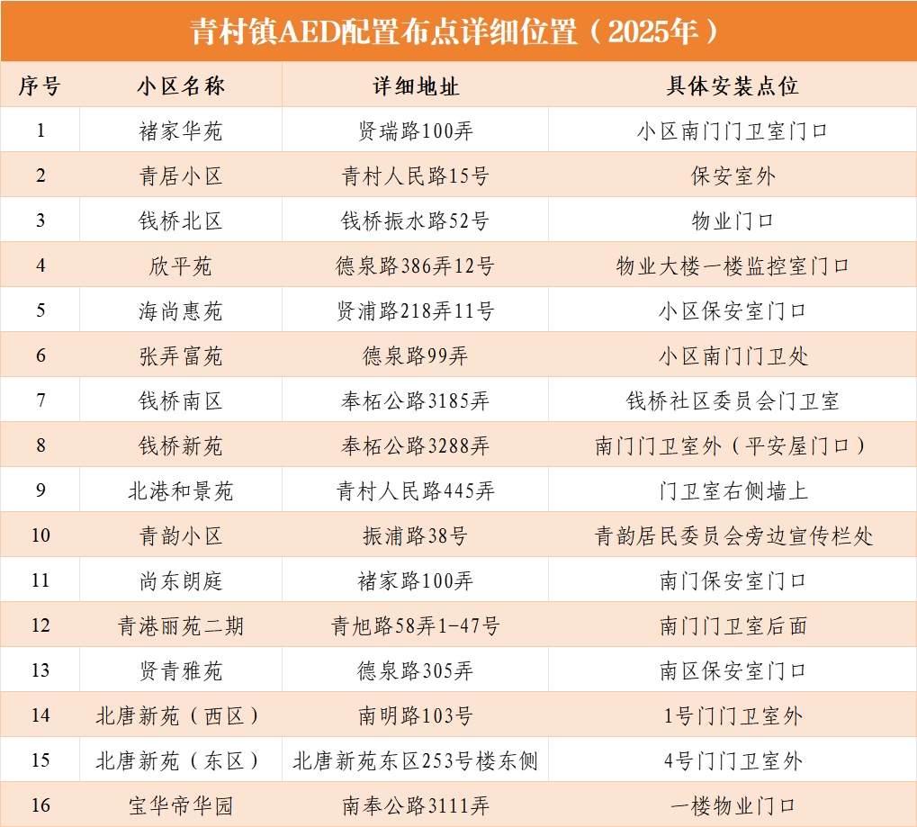 2025年,青村镇在辖区内常住人口超千人的居民小区完成16台AED配置安装。设备均位于小区出入口显眼位置,橙色标识清晰可辨,24小时可取可用。