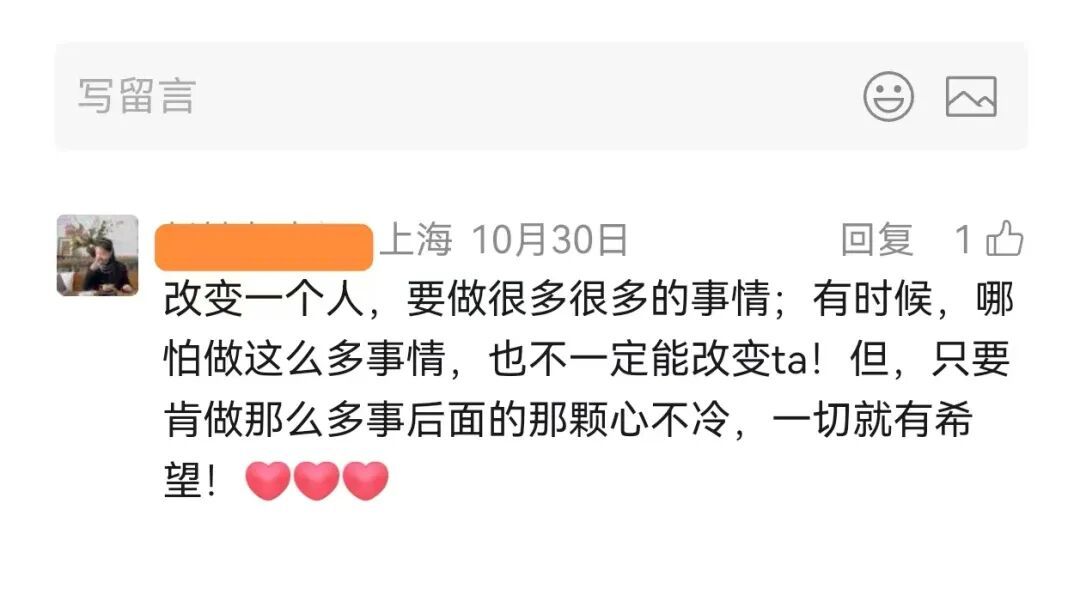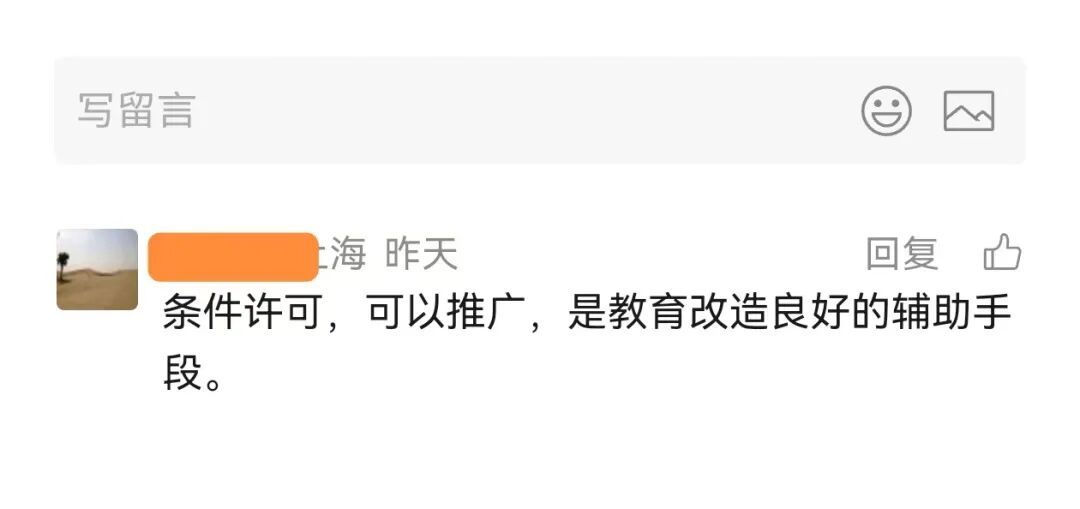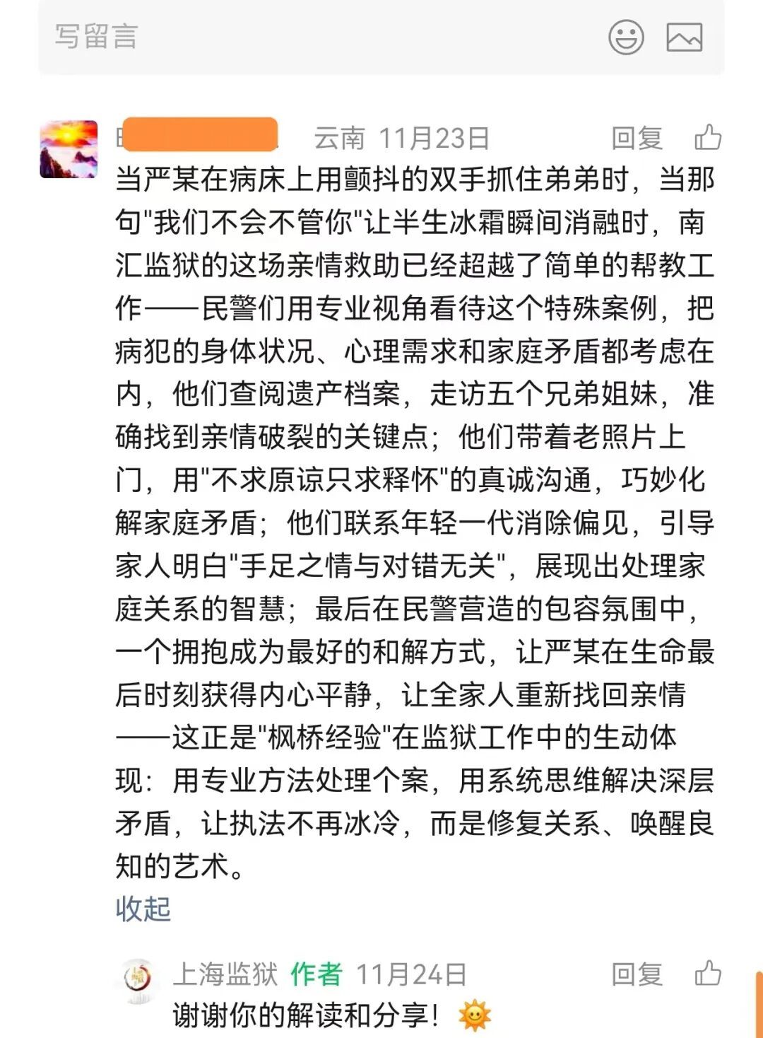 这是上海监狱微信公众号《一个拥抱,融化半生亲情冰霜》一文下面的留言。我们为这位云南网友的用心留言点赞,也对自身工作点赞,这充分印证了新时代“枫桥经验”进大墙工作的成效正被社会所认可。
