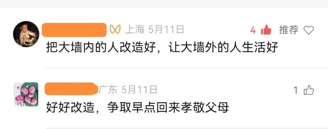 这是上海监狱微信视频号《【母亲节特辑】妈妈我错了!》和公众号《他们告诉我,这叫新时代“枫桥经验”》一文下面的留言,言语中透露出对改造工作的期待。“把大墙内的人改造好,让大墙外的人生活好”,这句话在全国监狱系统耳熟能详,而其正肇始于上海市南汇监狱。