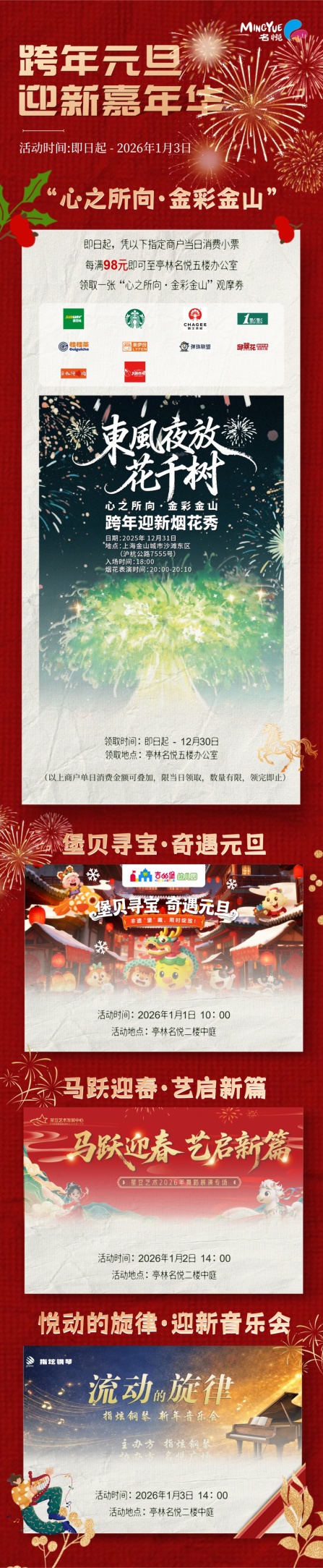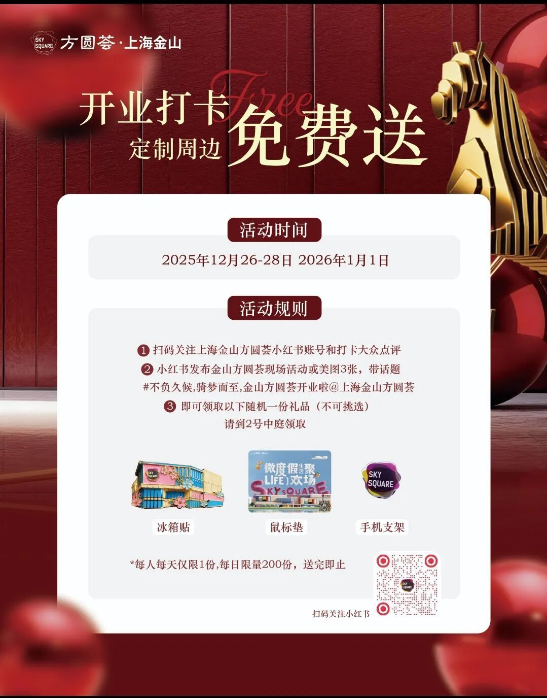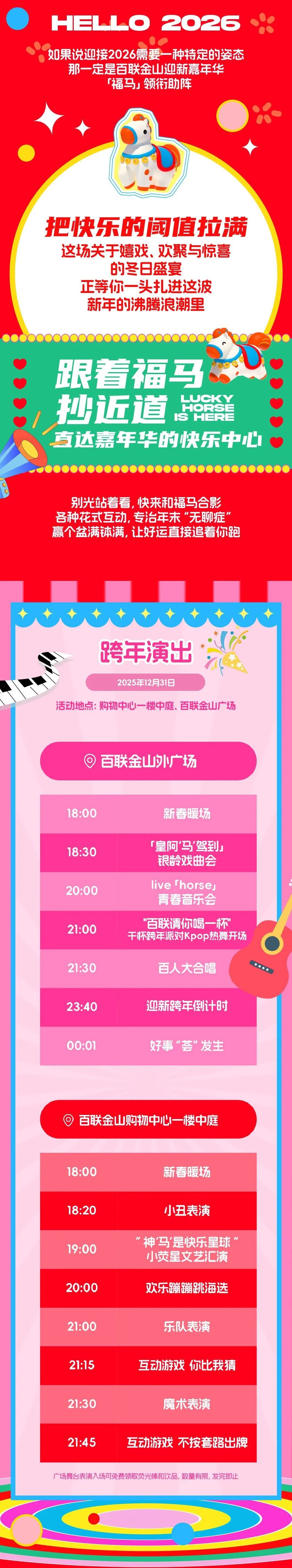 即日起至2026年3月,金山区围绕“马年贺岁”元素,打造“1+5+N”的系列促消费活动,贯穿元旦、春节、元宵三大重要传统节庆,邀市民和游客在金共享跨年之喜、过年之乐,感受满满烟火气!