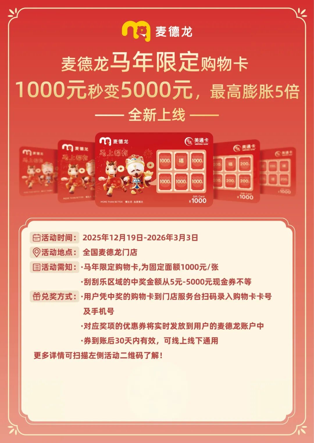 活动内容:购买马年限定购物卡(固定面额1000元/张),可在刮刮乐区域刮奖,中奖金额从5元-5000元现金券不等。
