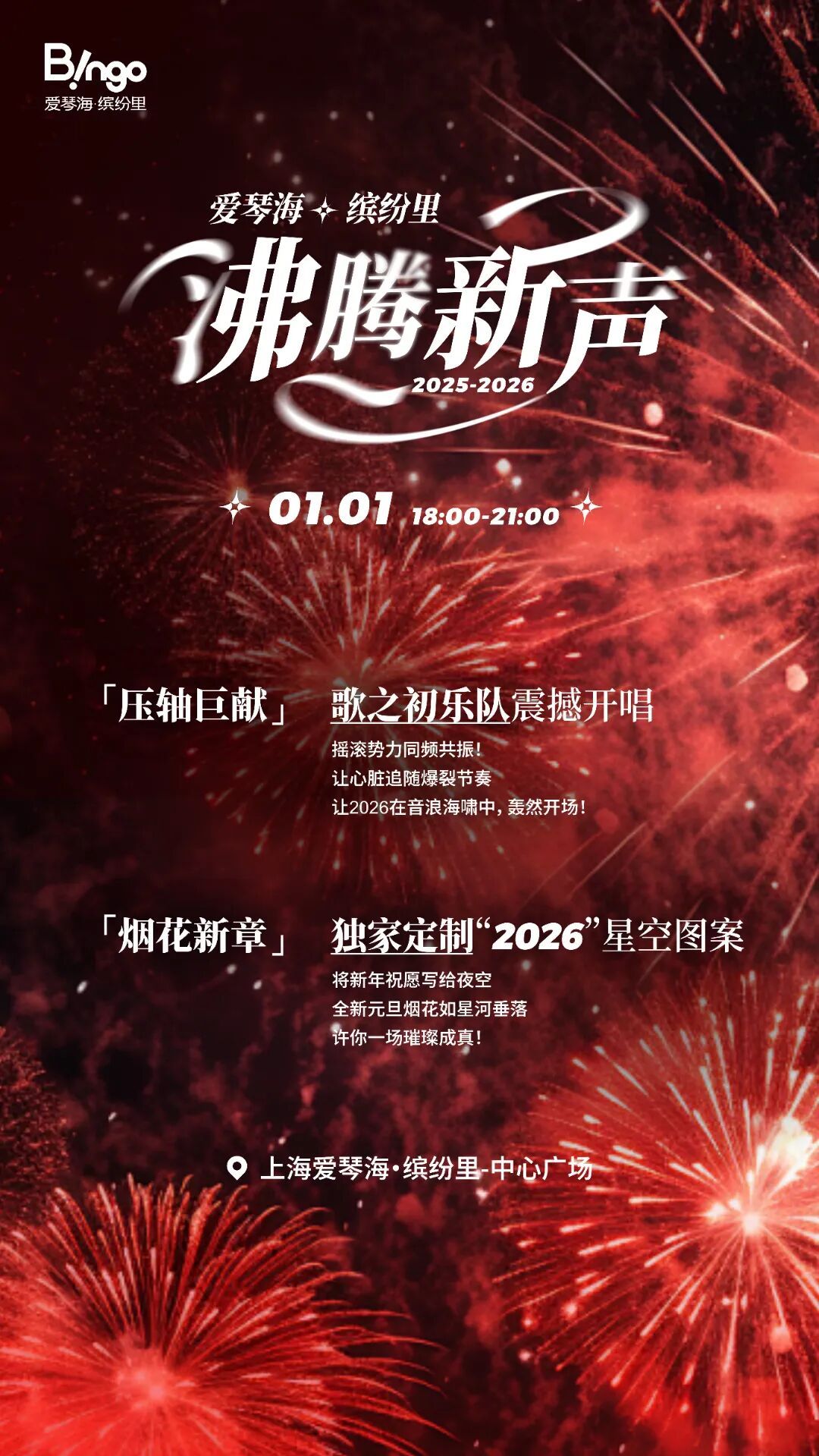 活动内容:1月1日晚8点,缤纷里将上演一场盛大的焰火盛典。在传统焰火基础上,特别加入“2026”特效数字造型烟花,在夜空中清晰呈现,打造独一无二的新年时刻。