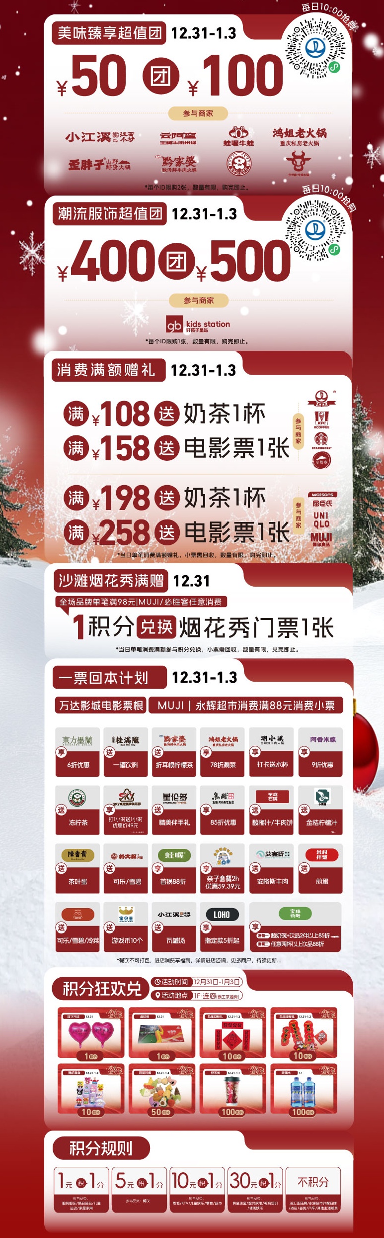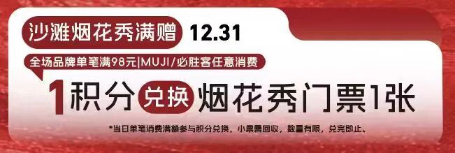 金山万达广场:凭全场品牌单笔消费满98元/MUJI或必胜客任意消费,即可参与1积分兑换金山城市沙滩跨年烟花秀门票1张,数量有限、赠完即止。