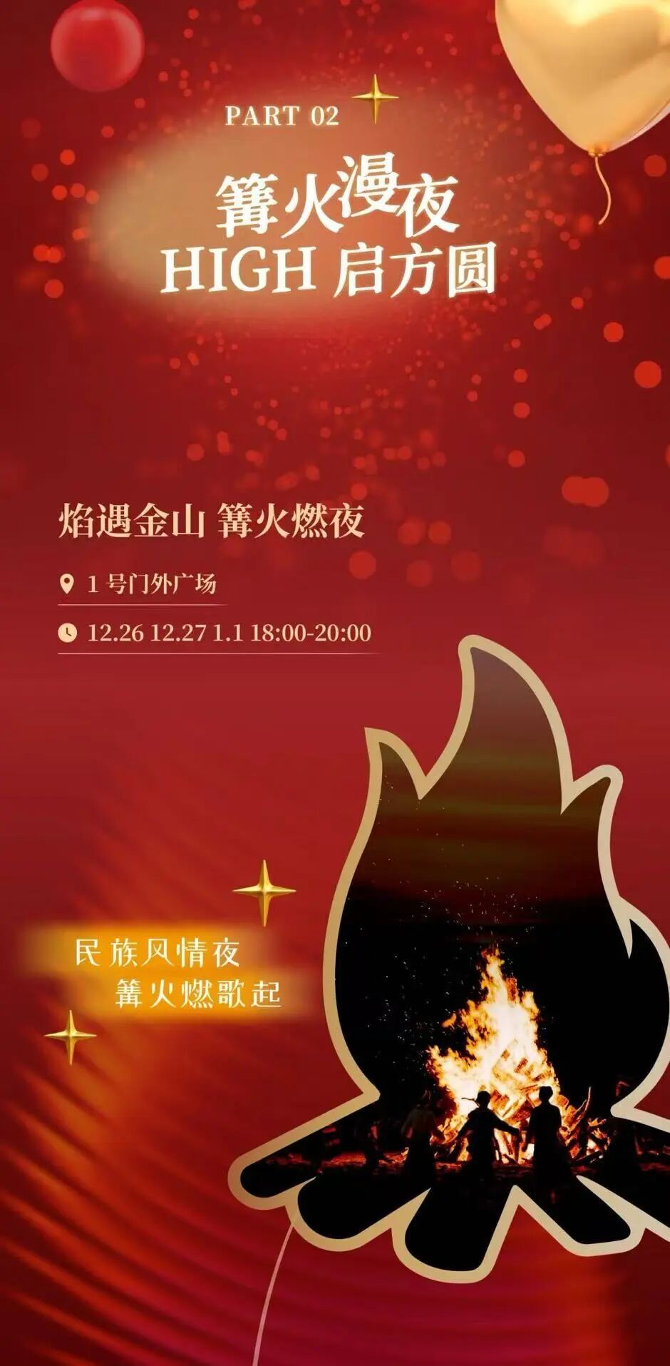 活动内容:18:00-20:00,在1号门广场外,点燃温暖、热烈的篝火,大家齐聚围拢在一起,形成一圈跃动的光影。