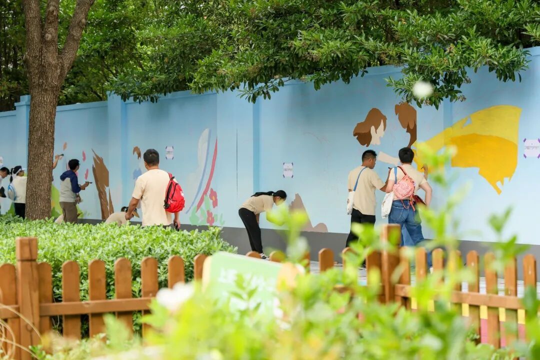 位于世博大道东南角的绿地,被创新性地纳入改造范围,打造成为上海首座儿童友好的双碳主题公园——云朵公园。该公园充分考虑儿童视角,以趣味形式普及环境保护知识。在云朵公园举行的“‘为爱上色,童绘云朵’2025年浦东新区‘六一’儿童节彩绘活动暨关爱孤独症儿童义卖集市”。活动当天吸引了全区近百户亲子家庭踊跃参与。在志愿者的带领下,小朋友们手持画笔,在公园墙面上尽情挥洒创意与想象,每一笔色彩都饱含着孩子们纯真的情感,共同完成长达180米的巨幅墙绘创作,为云朵公园增添艺术色彩和欢声笑语。