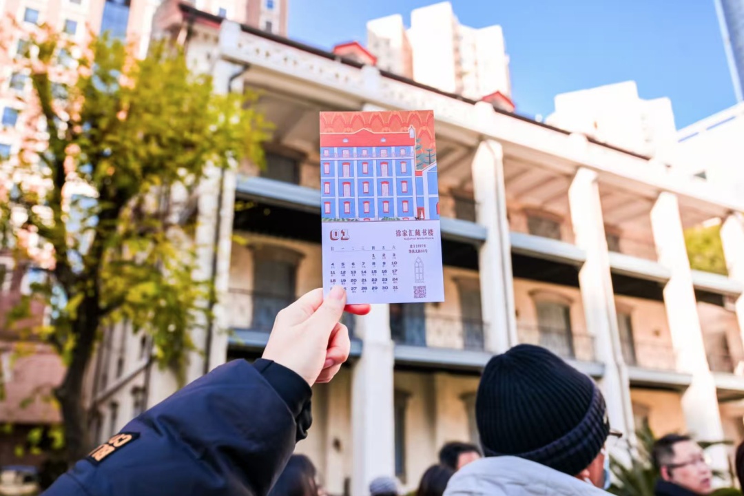 游客举起徐家汇源月份牌与徐家汇藏书楼合影