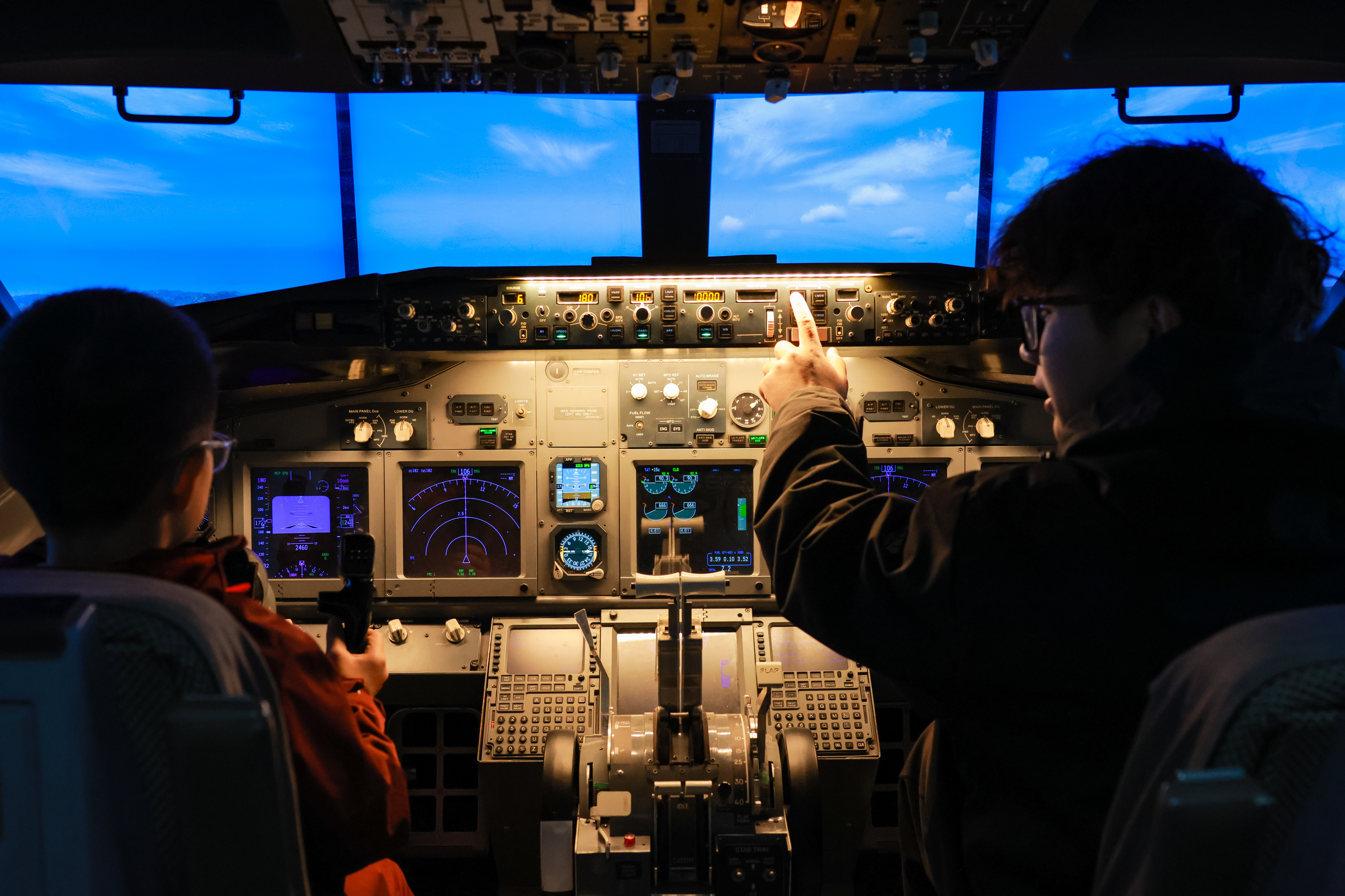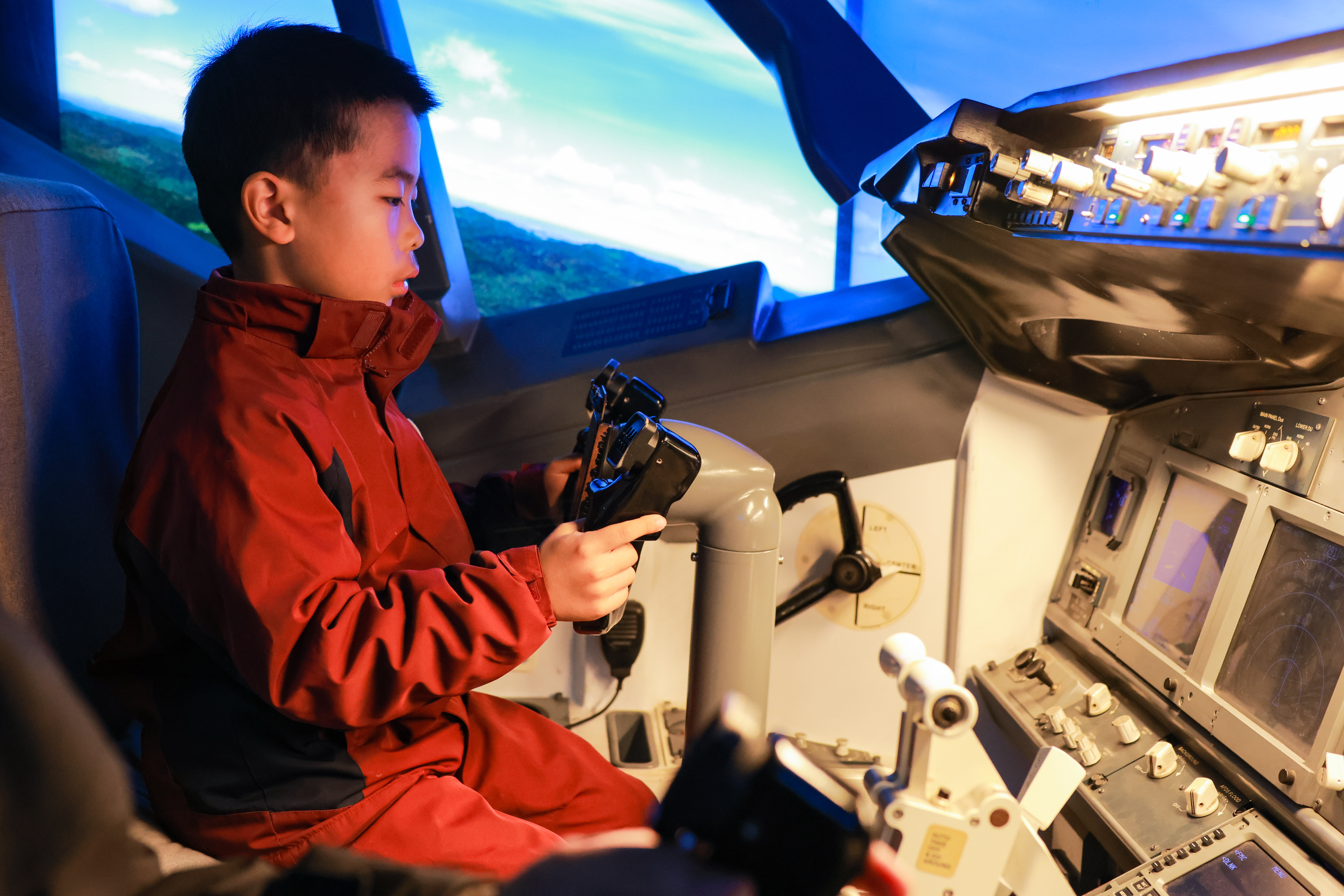 随后,同学们分组参与了“小小飞行员”模拟飞行体验。他们坐在模拟驾驶舱内,手握操纵杆,面对眼前的广阔“天际”,在指导员的帮助下尝试完成起飞、平稳飞行等基本操作。虽然只是模拟,但逼真的场景和操控反馈让每名“小飞行员”都全神贯注,兴奋不已,仿佛真的翱翔于云端。此外,活动还安排了航空知识小课堂,通过有趣的动画和实物模型,讲解了伯努利原理等基础空气动力学知识,让复杂的科学变得生动且易接受。