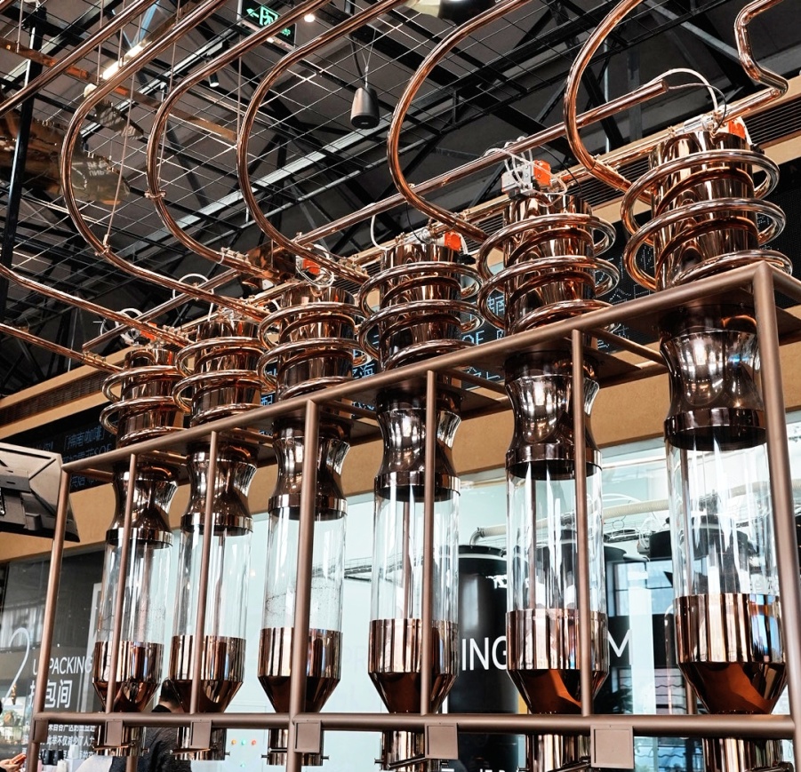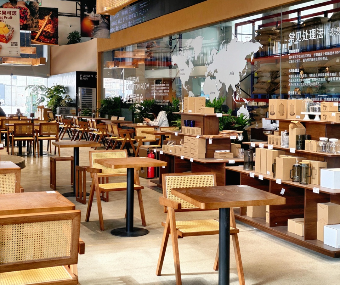 “拂南,寓意拂晓之光,向南而兴,象征着我们对咖啡自然、温暖与匠心的追求。”工作人员解释,“我们特意打造‘前店后厂’的模式,同时容纳烘焙工坊与消费区域,仅需一小时,让消费者亲眼见证一颗生豆从烘焙机到杯中的完整旅程。”这种设计不仅是视觉上的展示,对于资深咖啡爱好者而言,透明工坊是绝佳的“研究基地”,可以近距离观察不同产地咖啡豆的烘焙过程,根据自己偏好的风味挑选刚出炉的豆子;对于小朋友来说,滚筒里翻滚的豆子、此起彼伏的噼啪声充满新鲜感,成为直观的自然与工业启蒙课堂;而对于周边居民来说,拂南咖啡的入驻让大家在“家门口”就能享受高品质的新鲜烘焙咖啡。