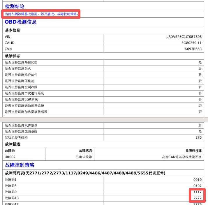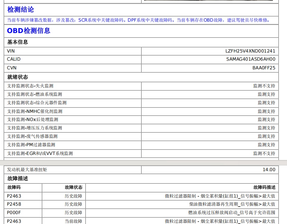 检查前期,监测站已通过系统梳理企业车辆登记信息、历史排放数据,精准筛选出16台国五、国六标准重型柴油车作为重点查验对象,并调配4名持证专业人员负责现场操作。检查现场严格遵循“设备核验—数据读取—异常分析”流程:工作人员先核对车辆行驶证、车架号与系统登记信息一致性,随后将新型OBD诊断仪与车载OBD端口精准对接,该设备除了常规OBD环保检验功能,还可初步判断车辆是否存在OBD刷写行为(实时通过终端采集车辆CVN数据,和备案的CVN信息进行对比),并读取车辆ECU数据,分析是否存在“关键故障码屏蔽”“扭矩限制放开”“尿素喷射系统异常”等违法问题。