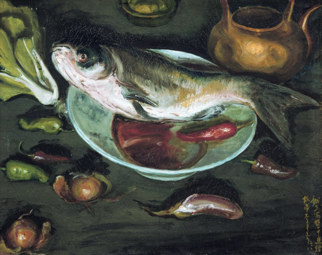 李铁夫《盘中鱼》 油画 82cm×97cm 广东美术馆藏