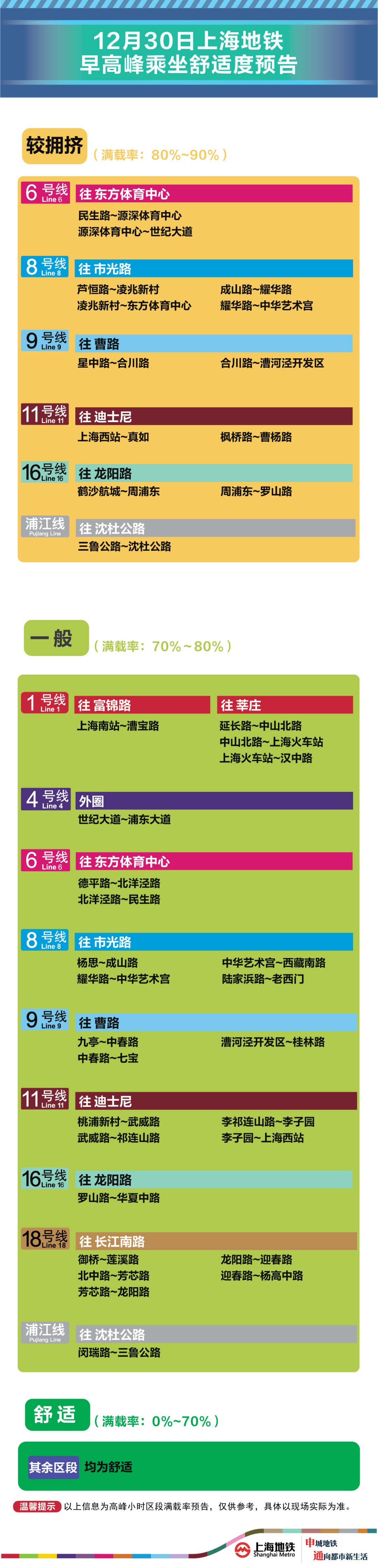 为提升上海地铁早高峰期间出行服务水平,提升乘客乘坐体验,上海地铁向乘客提供乘坐舒适度预告,方便乘客提前做好出行准备。