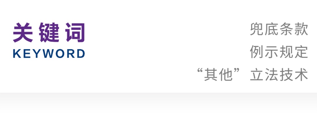 兜底条款有着特定的规范结构、承担着专门职能,它在法律文本中出现的频率很高,且在司法适用中又很容易引发争议,是一种需要认真对待的法条形式。迄今,部门法学者对兜底条款做过多方面的分析,并取得了丰富的研究成果,但法理学的研究尚不充分,还比较薄弱,有进一步深化拓展的空间。首先,法理学作为法的一般理论,可提炼出兜底条款的共同法理。兜底条款在制定法中分布很广,几乎每个法律文本都能找到它的踪迹,需要运用法的一般理论,能够从大量的立法例中抽象出超越部门法学的共同法理。其次,作为法的基础理论,可揭示兜底条款的深刻本质。兜底条款出现在许多法律文本之中,需要运用法的基础理论,透过复杂多样的法律条款形式,挖掘出深藏不露的内在本质,为相关的法律创制、法律实施,奠定坚实的法理基础。再次,作为法学方法论,可提供兜底条款的分析工具。目前,有关兜底条款的研究,多是立足部门法特别是刑法学,对一个个条文进行具体分析。除了少数有重大社会影响的兜底条款外,这种对某个法条兜底条款的单项研究浪费学术资源,且容易造成学术成果的碎片化。从法学方法论的角度,概括出所有兜底条款的一般法理,如逻辑结构、规范要件、功能定位、主要类型、实践样态、表述技术等,可取得事半功倍的效果。最后,作为法学价值观,可找准兜底条款的方向目标。法学价值观是一种系统化的法学认知观念,它对立法、执法、司法、守法等行为都产生重要影响。兜底条款的施行有较大的自由裁量空间,需要法理学的拓展,进行适当的内容填充、价值协调,总结出兜底条款的一般性适用规则;兜底条款的规范结构特殊,需要法理学的支撑,编制出一套有效的立法技术规范。法理学是以整个法律现象的共同发展规律和共同性问题为研究对象的学科,它是法的一般理论、法的基础理论、法学方法论和法学价值观,是分析兜底条款不可替代的重要理论工具。还应当注意的是,在法典化时代,兜底条款仍扮演着重要的角色。2020年民法典的成功编纂,为其他领域立法法典化提供了很好的范例。第十四届全国人大常委会立法规划提出:“积极研究推进环境(生态环境)法典和其他条件成熟领域的法典编纂工作。”党的二十届三中全会决定明确要求,深化立法领域改革,“统筹立改废释纂”。作为一种重要的立法形式,法典编纂被赋予重要的历史使命。法典具有“统一、完备、系统化”的形式特征 ,从表面上看,它似乎与假定条件、法律后果比较模糊的兜底条款是排斥、不相容的,但有效地运用兜底条款,可以更好地协调法律的稳定性与变动性、封闭性与开放性、现时性与长期性的关系,提高法律的实效性。兜底条款是以一个条文前面列举的主要事项为典型情形,对剩余的次要事项,以含有“其他”的命题式语句,体现为法律文本层次结构“项”的总括规定。兜底条款是由多个词语构成的独立句子,其自身有若干个组成部分,各个部分既相对独立、分工明确,又相互联系、紧密配合,呈现出有序的规范结构。第一,以“其他”为标识语。“其他”是兜底条款的外观标志,但不是全部含有“其他”的句子都是兜底条款,需要仔细的甄别。一般地,“其他”的含义主要有二:一是指列举事项以外的事物;二是指列举主要事项后的剩余次要事项。在法律中,“其他”主要有两种用法,一是除外规定,即在排斥性关系中关于除外事项的规定。比如,《中华人民共和国刑法》(以下简称《刑法》)第67条第2款关于自首的规定。《刑法》第67条第2款所列举的典型事项与“其他”指涉的事物,是外延完全不重合的全异关系,非本文的研究对象。二是例示规定,即主要事项列举后,还有剩余的次要事项的规范样式,其标准的规范样式为:两个以上典型事项+和、以及、及等连词+其他+上位概念。例如,《中华人民共和国民法典》(以下简称《民法典》)第110条第1款的规定。在第二种用法中还可以具体区分为例示规定与兜底条款。兜底条款是一种特殊的例示规定,它与例示规定之间既有共同点,也有差异处。一般地,例示规定是立法者对于意欲调整且难以穷尽的事项,先对几个典型事项予以列举,再连缀助词“等”或代词“其他”,最后加上较为抽象的上位概念以全面涵盖调整事项的法条形式。兜底条款与例示规定之间是属概念与种概念的关系,前者为后者所包含。但是,在法学界,人们往往将兜底条款等同于一般的例示规定,两者不作区分。有学者认为,刑法中的兜底条款,是指刑法规定的,立法者无法穷尽法条描述之情形时所采用的概括条款,通常用“其他”或者“等”的表述方式。《刑法》第151条第3款“走私珍稀植物及其制品等国家禁止进出口的其他货物、物品的”规定中重复使用“等”与“其他”,有学者认为这属于“双兜底”条款。这种将兜底条款与例示规定相混同的观点,有待商榷。兜底条款是例示规定的一种特殊形式,这是“双层”例示规定,而非“双兜底”条款。该法条的第一层次是一般的例示规定,第二层次才是作为特殊例示规定的兜底条款。兜底条款是一种特殊的例示规定,它的设置除了遵循例示规定的一般性技术规范外,还有其特殊的要求。“等”与“其他”都具有列举未尽的含义,并且都必须以列举事项为前提才能确定其所包括的事项范围,但是“等”与“其他”有着明显
