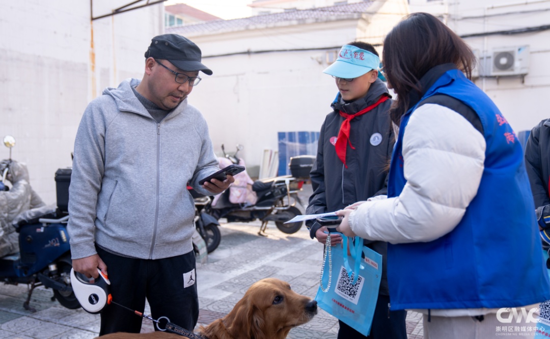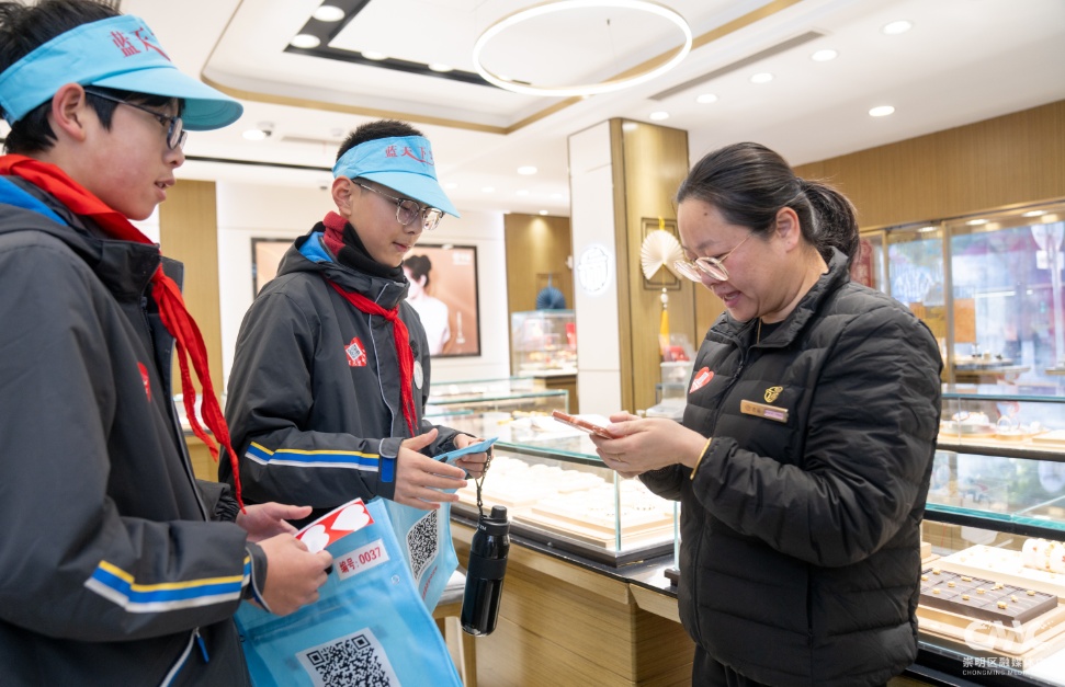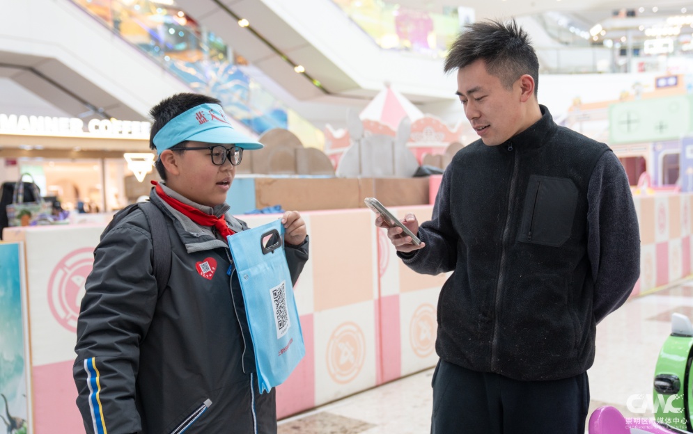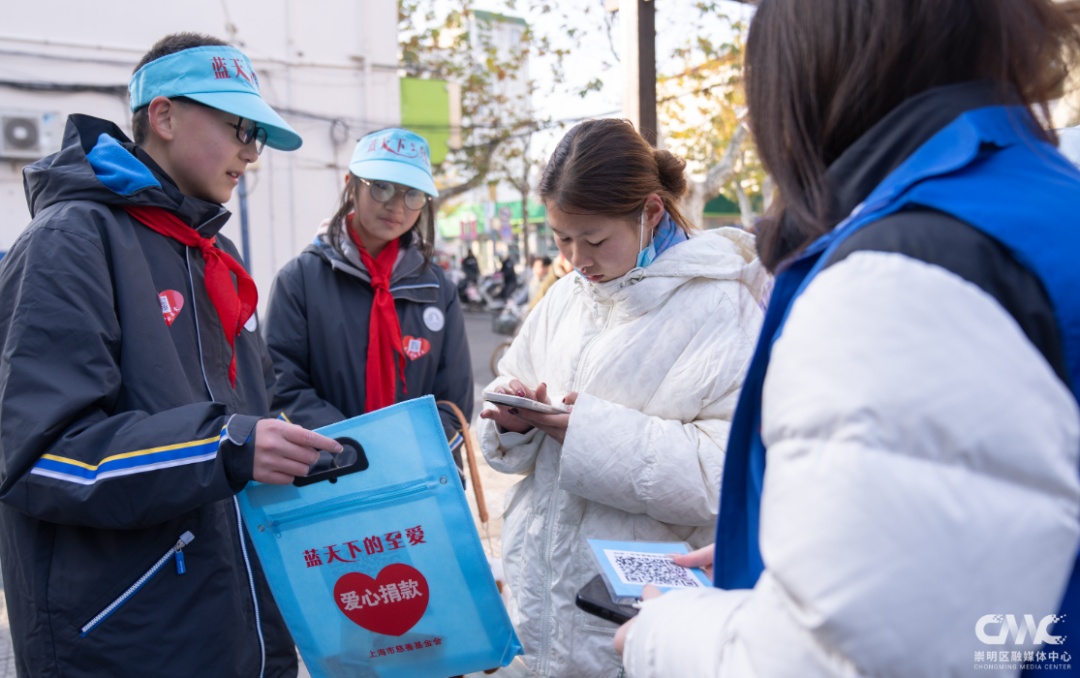 当天,在城桥镇人民路与八一路路口,来自上海市崇明中学附属东门中学的学生们头戴标志性天蓝色帽子,手持统一募捐袋与现场志愿者组队行动,向过往市民和沿街商铺介绍募捐项目和善款用途,并发放爱心贴,引导大家通过扫码等方式参与捐助。