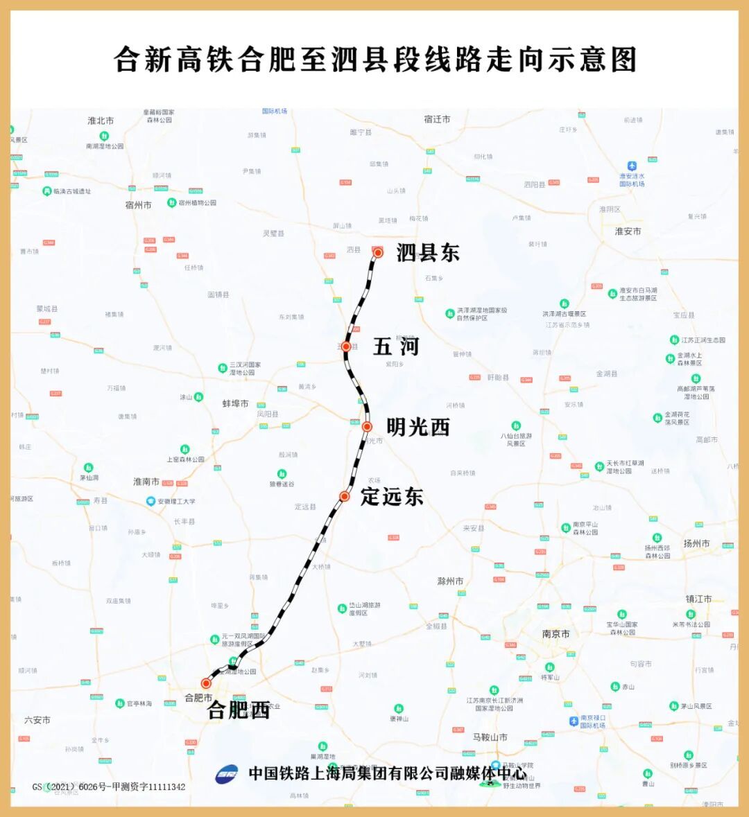合新高铁合泗段起自合肥市蜀山区的合肥西站,经滁州市定远县、明光市,蚌埠市五河县,接入位于宿州市泗县的泗县东站,线路全长198公里,全线共设合肥西、定远东、明光西、五河、泗县东5座车站,均为新建车站。