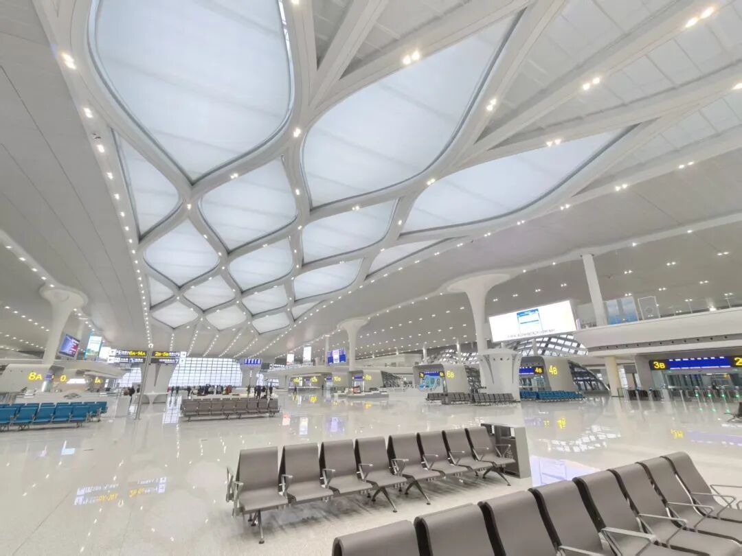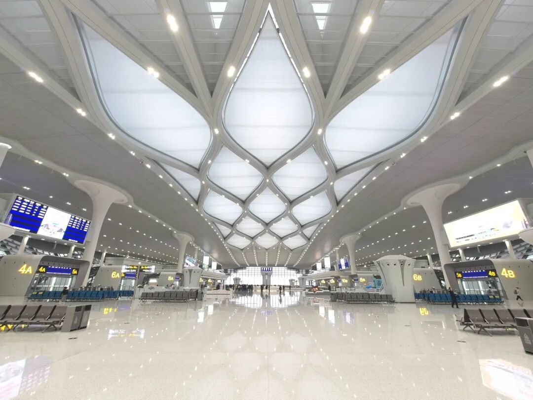 合肥西站积极运用智能化手段服务旅客出行。高架候车厅“水滴天窗”面积达1.04万平方米,单体长35米,采用大跨度连续双曲面铝板、Low-E中空玻璃及渐变水蓝色遮阳膜,兼顾自然采光、遮阳与防尘功能;东西两侧玻璃幕墙配备电动遮阳帘,可以根据光照实时调整室内光环境;“水滴天窗”通过顶面泛光照明模拟巢湖夜景波光,巧妙融入地域文化意象,点亮城市天际线。车站设有智能运维管控平台,可对幕墙、金属屋面、机电系统等进行实时监测与远程控制,并引入智能巡检机器人,大幅提升了大型复杂建筑的运维效率。