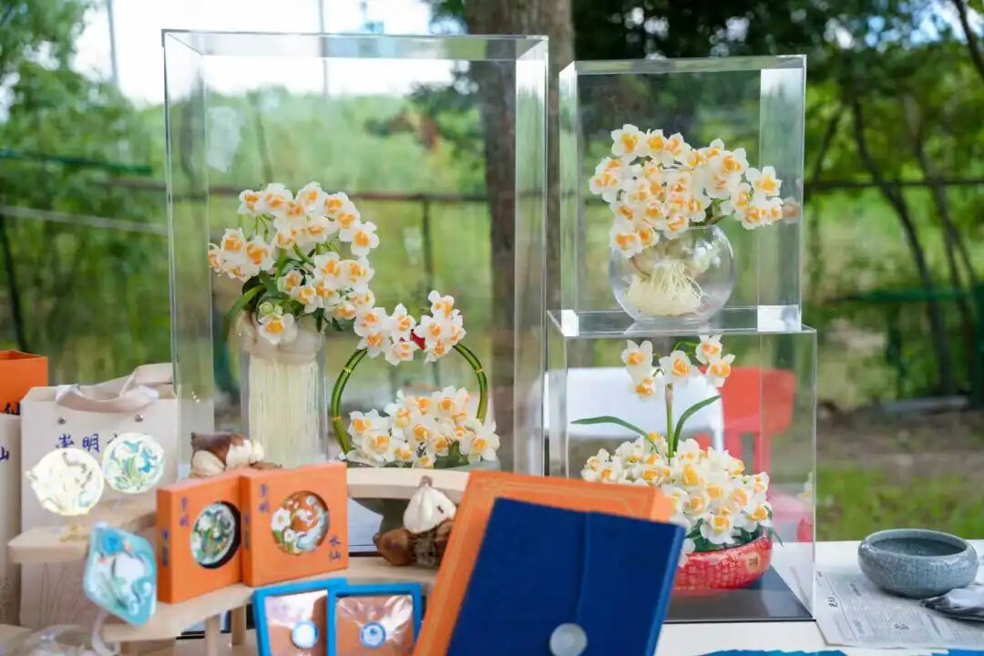 在向化好物区,汇聚了西红花、北港大米、六滧蜜薯、古宗白山羊、逸汝服饰等本土名优特产与手工艺品。水仙文创区里,“崇明水仙”化身为泥塑花、创意冰箱贴、玩偶盲盒、商务笔记本等各种精美文创,等你来收藏。还可以探索有趣的“渔文化”联名产品,甚至体验一把开启珍珠蚌盲盒的惊喜!