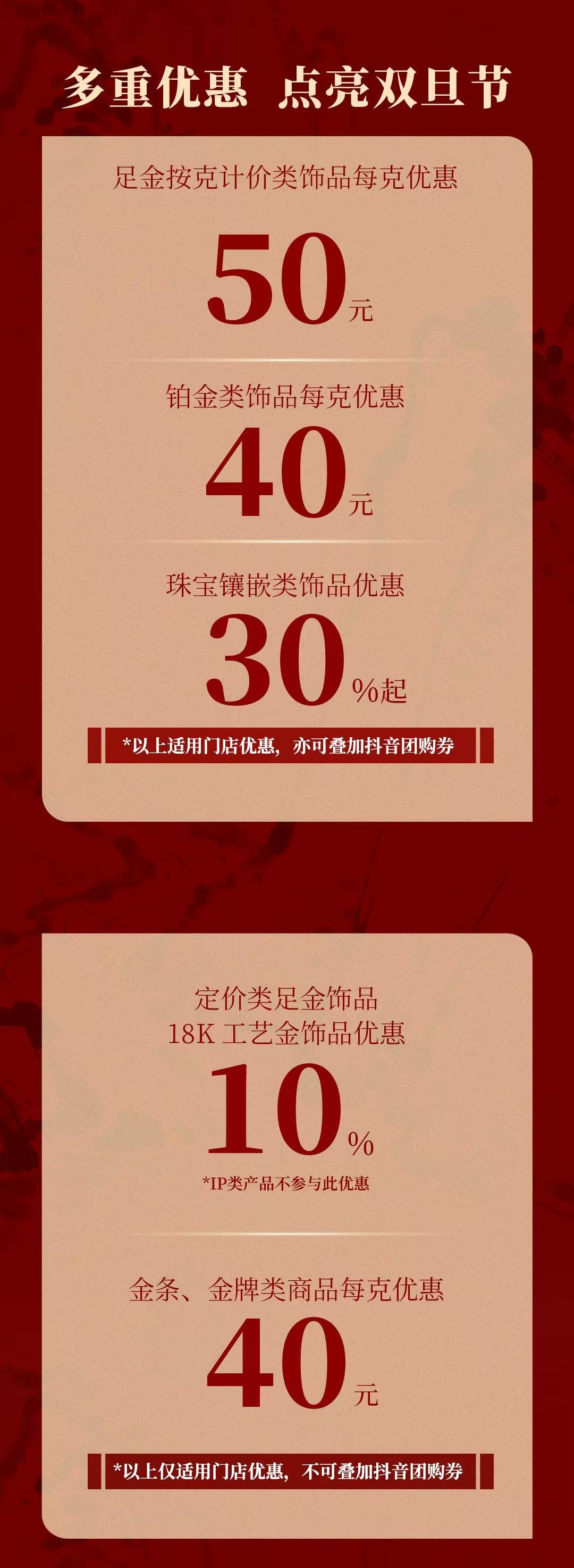 老凤祥:(1)足金类饰品优惠50元/克;(2)铂金类饰品优惠40元/克;(3)金条、金牌类商品优惠40元/克;(4)定价类足金和18K工艺品饰品优惠10%;(5)珠宝镶嵌类饰品优惠30%。