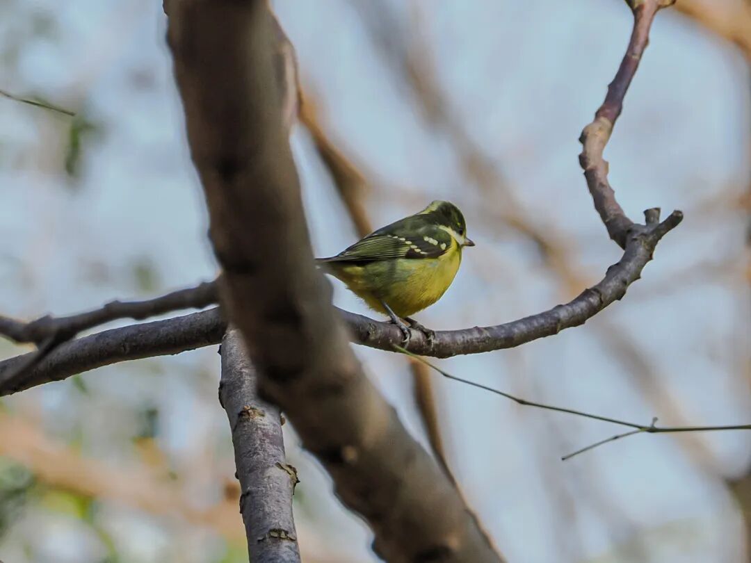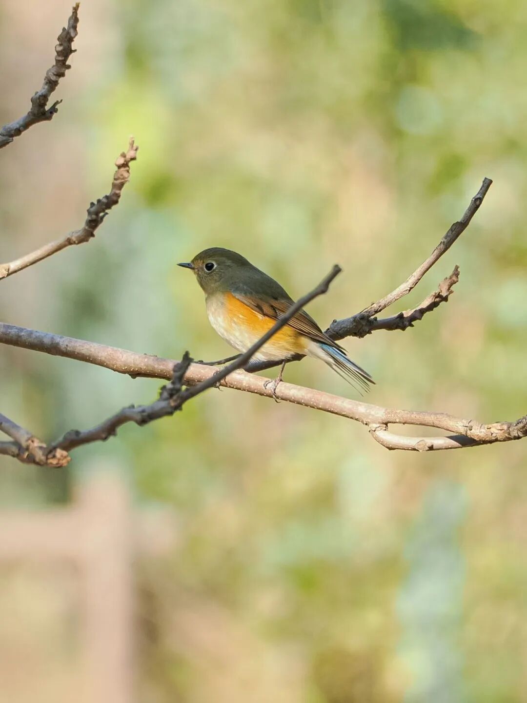 嫩黄羽毛的绿背姬鹟蹭过叶尖,