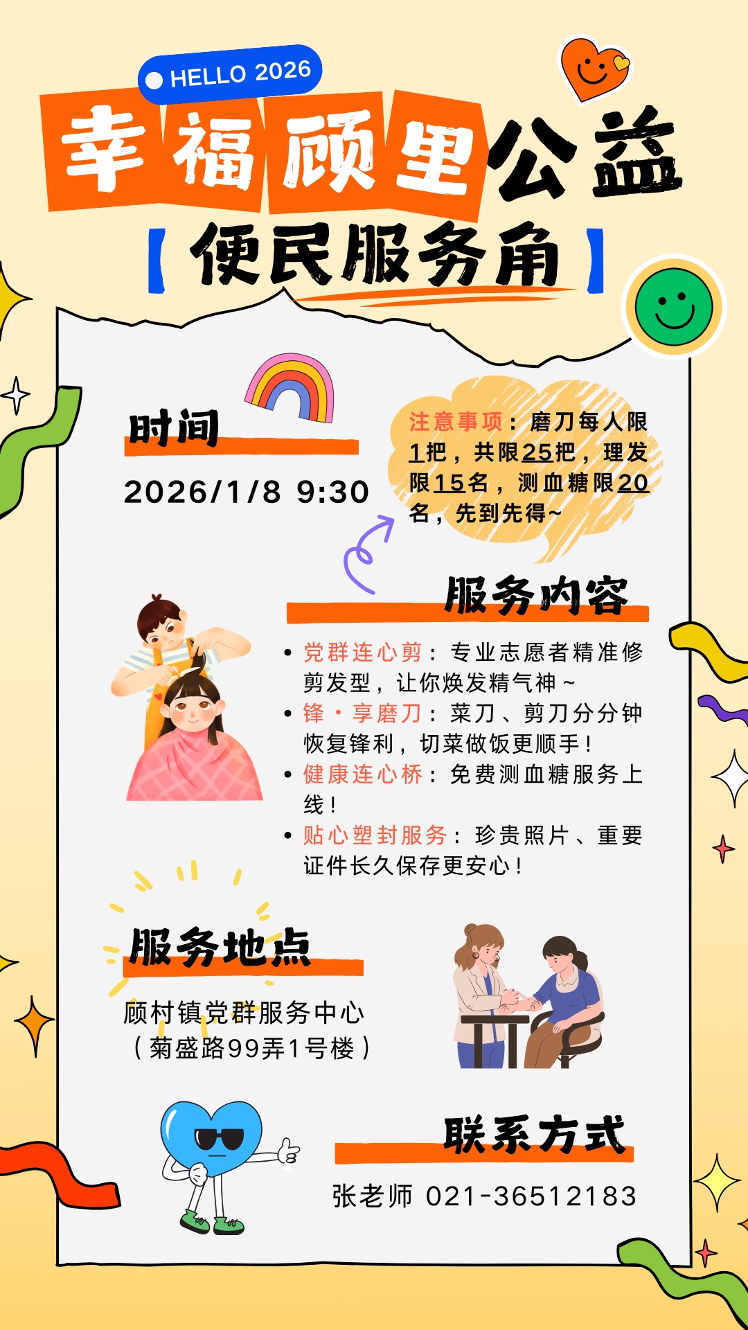 更值得期待的是,2026年“幸福顾里”便民服务角还将构建可持续的暖心服务体系。除了首期的实用服务,后续还会新增“义”起服务(义诊、配钥匙)、健康会客厅(口腔健康、中医养生宣讲)、“法润红心”工作坊(法律咨询、法治宣传)等更多便民项目,让服务覆盖生活方方面面,让各群体都能在这里找到专属便利~