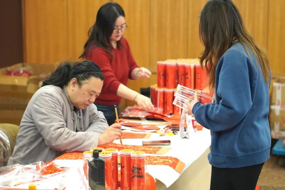 本次活动,十余家沿街商铺和楼宇企业参与设摊,现场暖意融融、人头攒动。步入楼宇党群服务站,“民俗区”的书香扑面而来,几位书法爱好者端坐案前,将对新年的美好期许倾注于笔墨之中,笔法遒劲的春联、寓意吉祥的“福”字在挥毫泼墨间跃然纸上。楼宇企业员工们在接过春联与“福”字的瞬间,脸上漾起了幸福满足的笑容。这份手写的温度,让年味愈发醇厚。