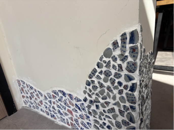 走进室内,温暖的气息扑面而来。绿植在各处生机勃勃,原木桌椅泛着温润的光泽。吧台后的照片墙贴满了拍立得,记录着这里最初的时光。年关将近,长桌上备好了红纸和毛笔。一旁其他客人写的“福”各有千秋,有的将福字与马图案合二为一,有的笔触稚拙可爱。有一种久违的、属于传统节日的松弛与喜悦。那一刻我忽然觉得,传统或许从来不是刻板的模子,而是每个人都可以用自己的体温去捂热、用当下的情感去诠释的流动记忆。慢慢了解到店铺装修的设计理念,院内保留了传统榫卯结构的建筑元素,同时利用店内废弃的瓷器碎片,拼贴成墙面装饰,既环保又富有艺术感。主理人屠华斌提到整个小院筹备周期长达一年,远超出行业常规速度,显示其对品质的极致追求。大面积落地玻璃的设计是为了让客人与自然融合,主题“野趣”贯穿始终。从对话能感受到,这是一次理想主义与商业现实的碰撞,他更看重为顾客提供情绪价值,而非追求快速盈利。