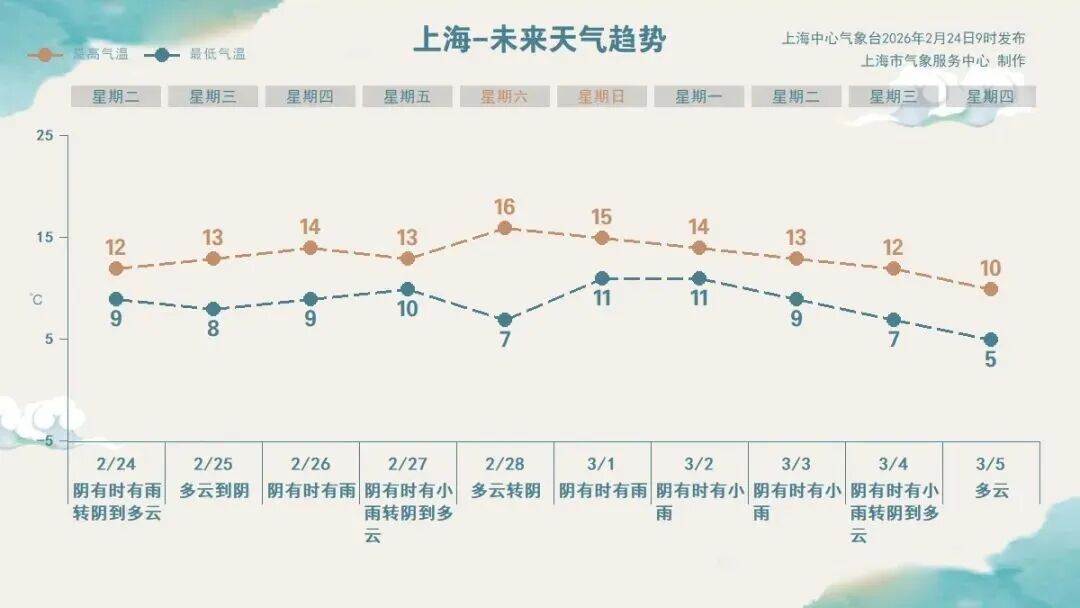本周上海天气总体是雨多晴少,明天和周六是唯二没有雨水打扰的日子。受高空槽影响,周四至下周初申城多降水天气过程,其中周四和周日前后的降水较为明显,气温略有起伏,最低7~11℃,最高13~16℃,体感偏湿冷,防寒保暖工作不可松懈。
