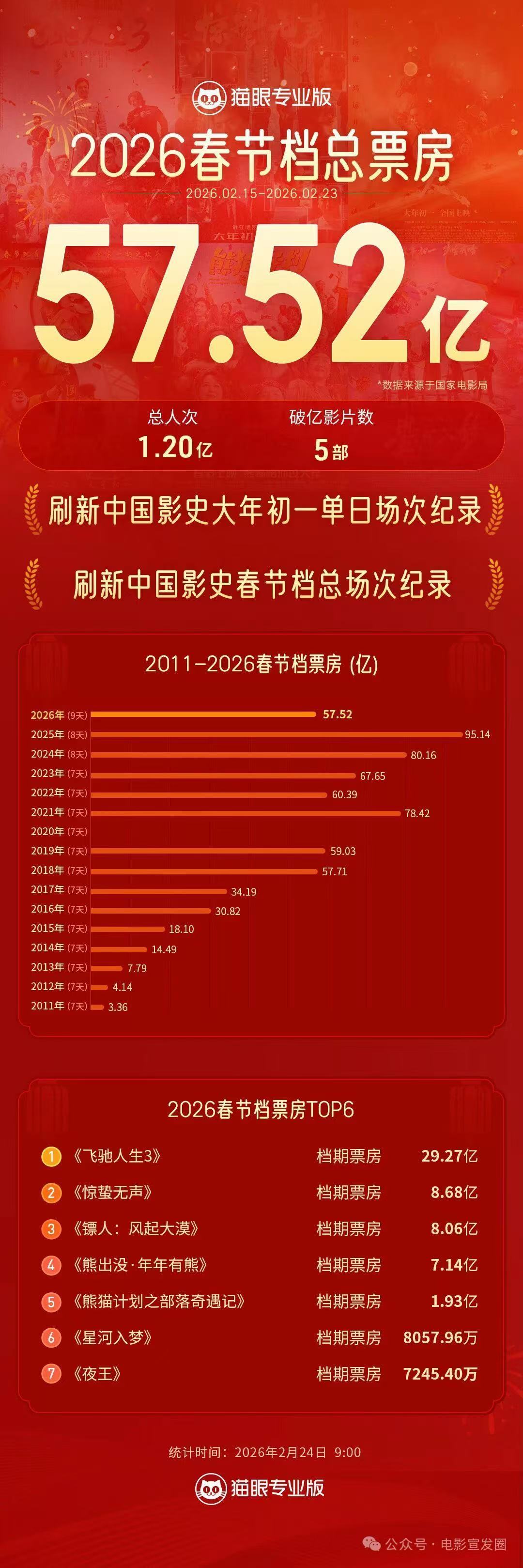 春节档电影票房破57亿