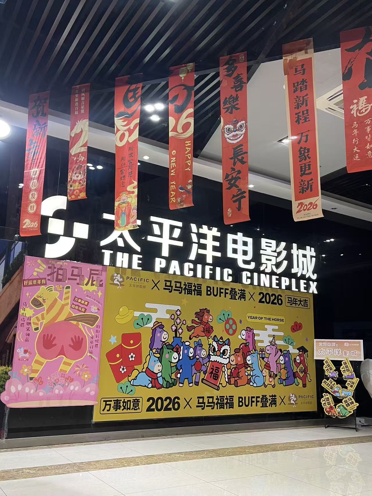 太平洋影城松江店经理马丹丹介绍:“《飞驰人生3》热度居高不下,影院排片占比提升至35%,平均上座率超八成。”影院同步布置春联福字,推出影片印章与马年主题周边,进一步烘托春节观影氛围。
