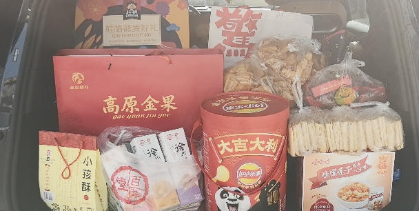 打开安亭镇绿苑新城居民王女士的后备箱,仿佛是闯进了她老家江苏徐州的特色零食铺,从蜜三刀、花生糖到麻片、小孩酥,这些全是王女士小时候最爱的零食。