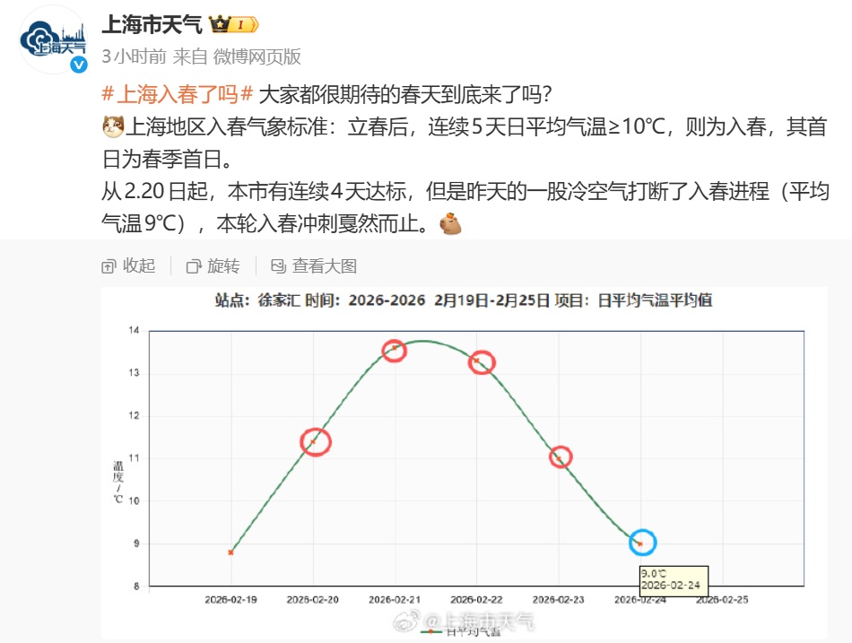 从2月20日起,本市有连续4天日平均气温≥10℃,但是昨天的一股冷空气打断了入春进程(平均气温9℃),本轮入春冲刺戛然而止。