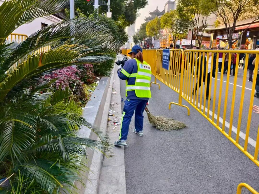当夜色渐深,游客散去,豫园的灯光依旧璀璨,而环卫工人的工作仍在继续。褪去白日的喧嚣,他们顶着寒风,拿起高压水枪对路面积存的油污、积垢进行深度冲洗,一遍又一遍,直到路面恢复洁净本色。从清晨到深夜,从普扫保洁到深度清洗,从答疑指路到暖心服务,他们用十二小时的坚守,为次日到来的游客筑牢洁净防线。