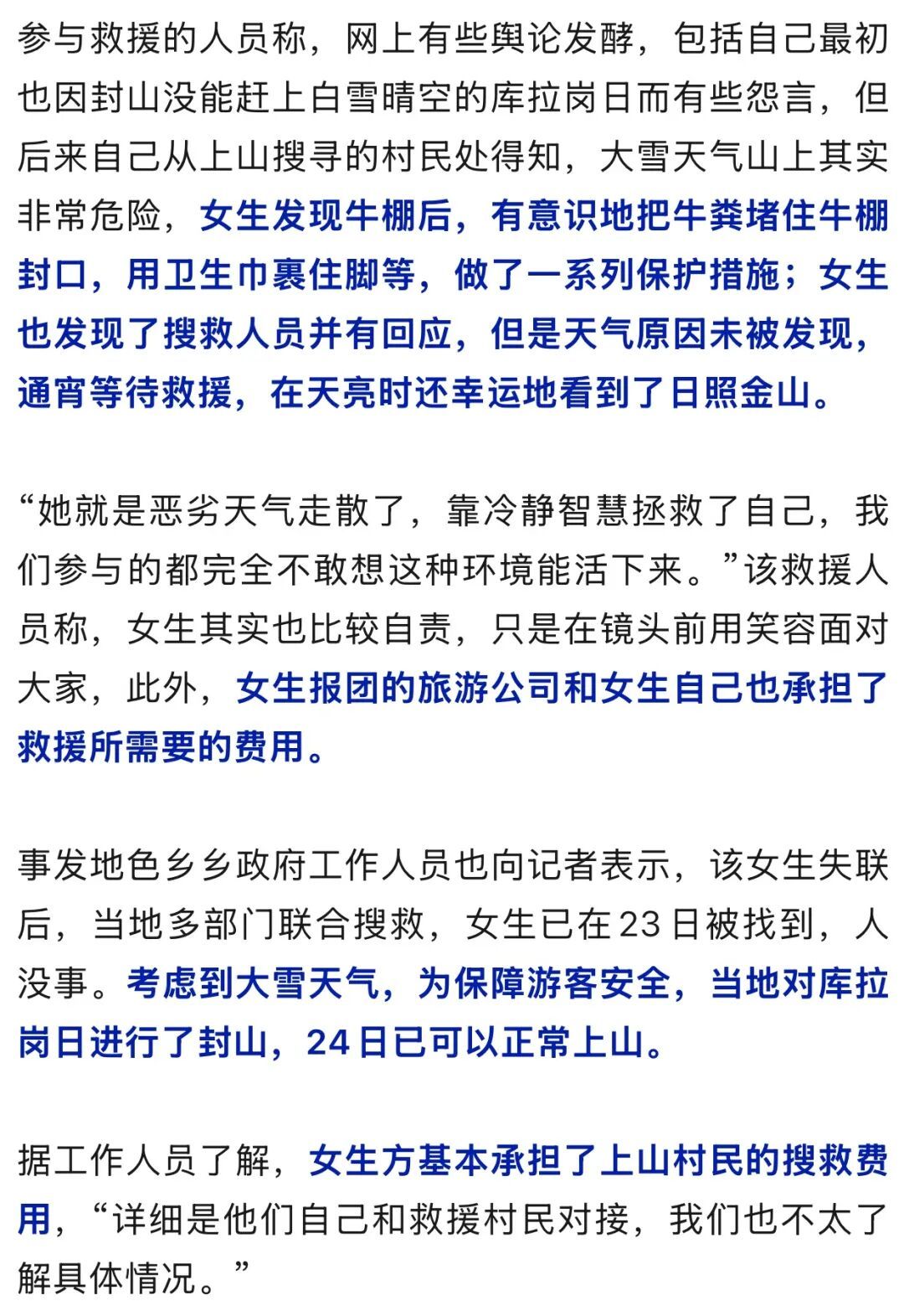 “她很厉害,不是新手,有保护自己的观念,不然会很危险。”民宿老板称,失联女生是在一牛棚处被找到,里面有牛粪,可以帮助维持体温。女生被找到时身体状态尚好。