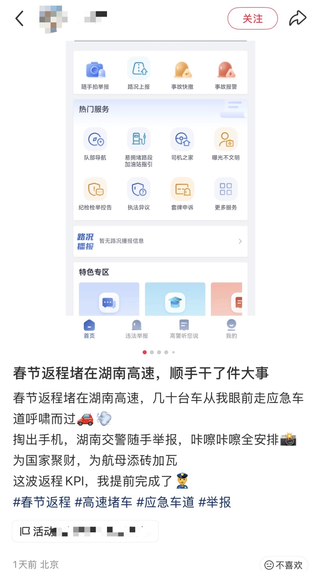 记者注意到,23日湖南高速警察官微发布消息称,为应对春节假期返程高峰,湖南高速交警临时开放多条高速部分路段的应急车道。不过,交警也提醒驾驶人按指示通行,非高峰时段禁止占用应急车道。对此,“十八孖”向记者表示:“我举报的都不在(临时开放)范围内。”