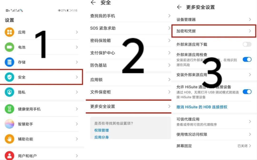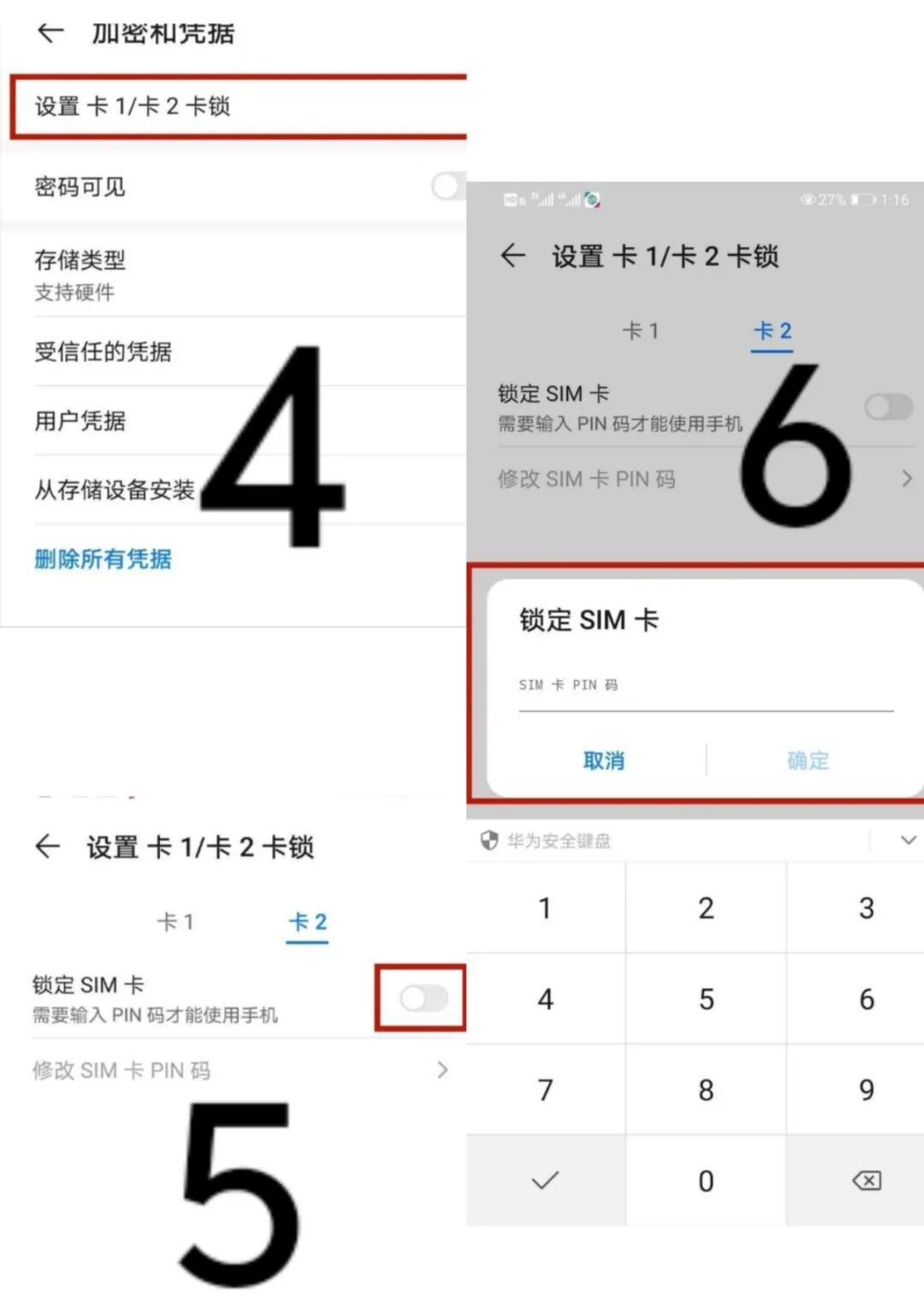 点击设置,选择安全选项——点击更多安全设置——选择加密和凭据——选择设置卡1/卡2锁——点击锁定SIM卡按钮——第一次设置密码时需先输入原始默认的PIN码(一般为“1234”)——输入个人四位密码后即设置成功。