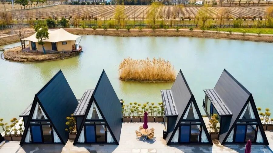 风拂杨柳、景入窗前,全屋采用通透落地玻璃,将湖泊、田野、垂柳尽数纳入。室内配套实木家具与高品质电器,质感温润、布局合理,在亲近自然的同时,尽享居家的便捷与安心。