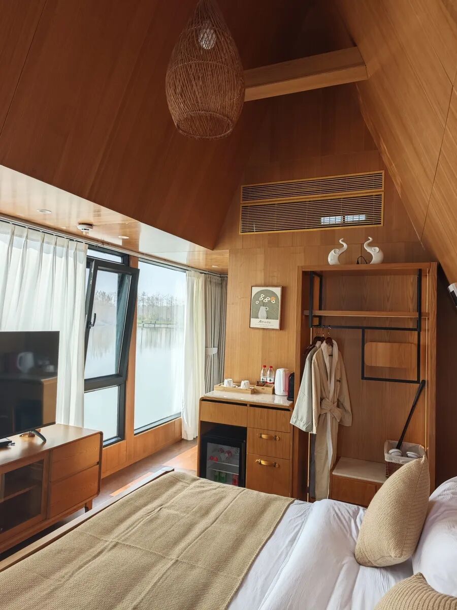 临湖而建、伴水而居,全景玻璃设计让湖光山色无死角映入室内,仿佛住进一幅江南水乡画卷。清风携着湖水与草木清香,湖面波光、水鸟翩跹,静坐窗边煮一壶清茶,所有的疲惫都能被这一方温柔景致轻轻治愈。