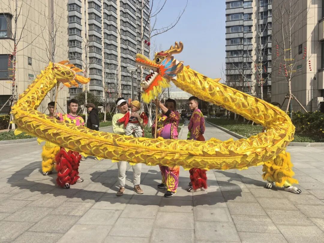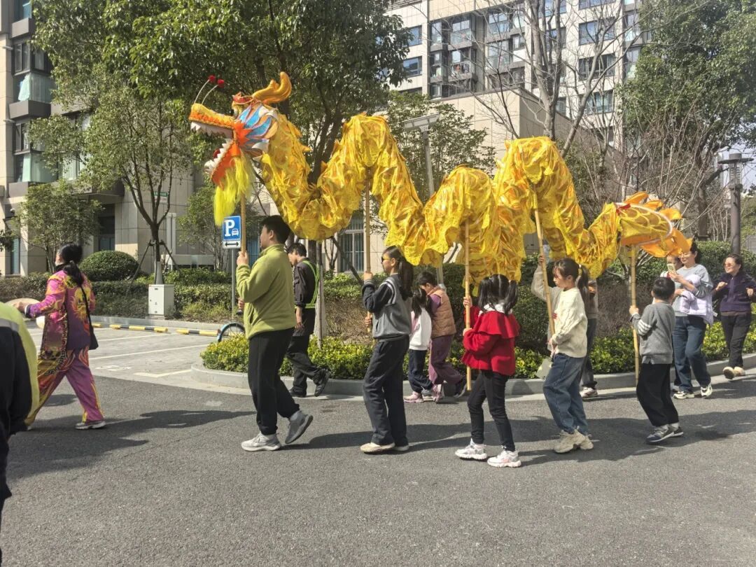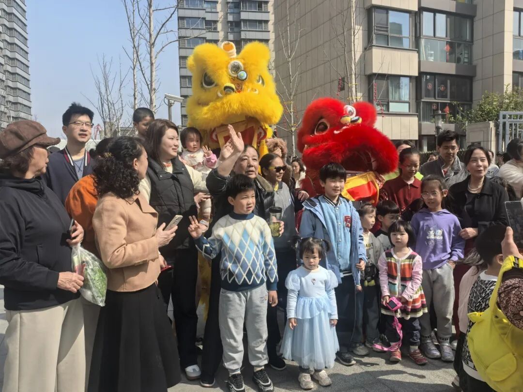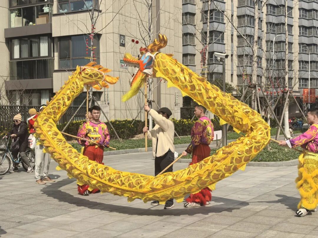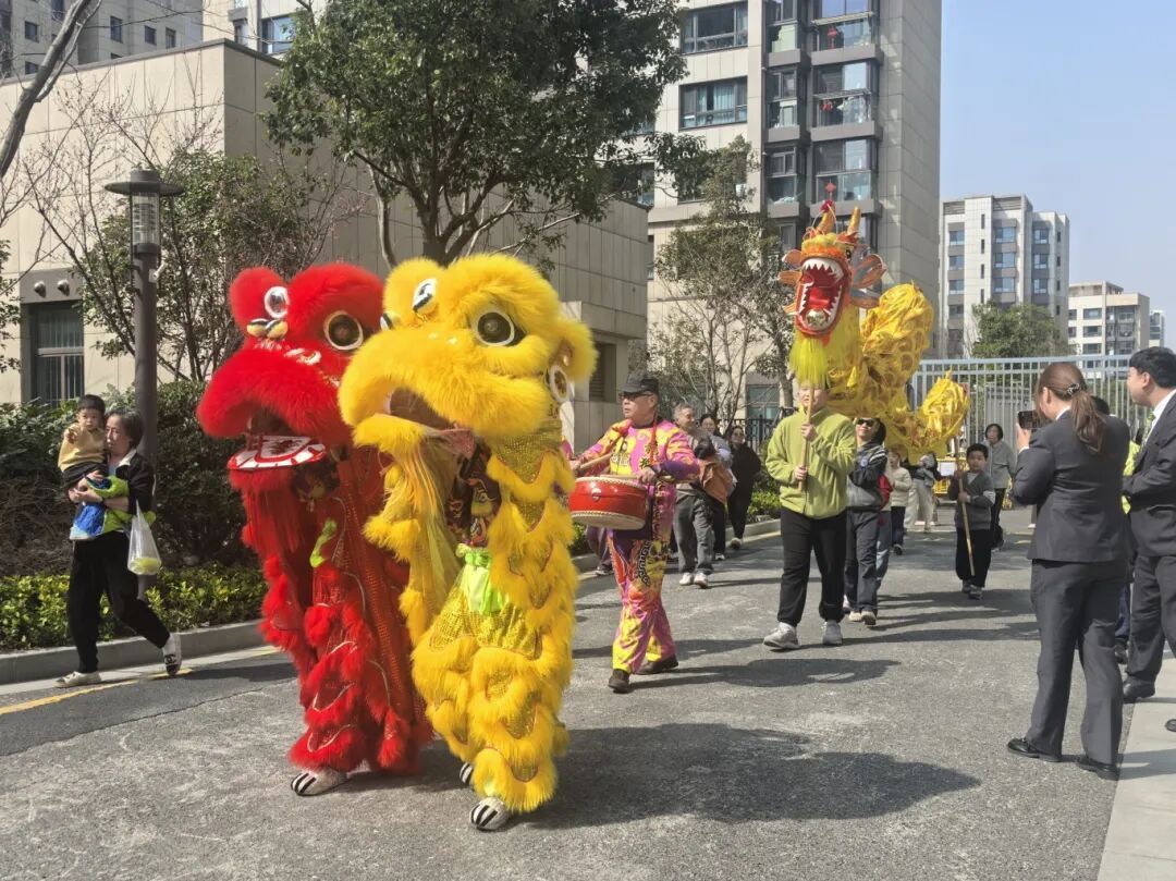 伴随着锣鼓声,舞龙舞狮巡演开始。队伍前方,两只狮子昂首摆尾、憨态可掬,仿佛正向居民们拜年问好;黄灿灿的巨龙紧随其后,翻腾飞舞,沿着小区主干道蜿蜒前行。居民们扶老携幼,争相围观,脸上洋溢着喜悦的笑容。