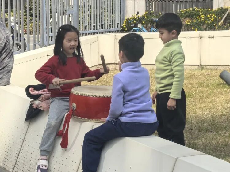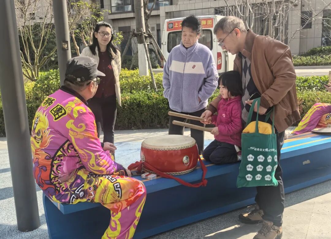 巡演结束后,小区步道变为临时舞台。专业队员继续舞龙表演,赢得阵阵掌声。一旁,几位“社区小先生”围在打鼓的爷叔身边,向他请教技巧。爷叔耐心讲解节奏和手法,孩子们认真尝试、反复练习。“学打鼓很有意思,既体验了传统民俗,也感受到了过年的热闹。”一名参与的小朋友说。