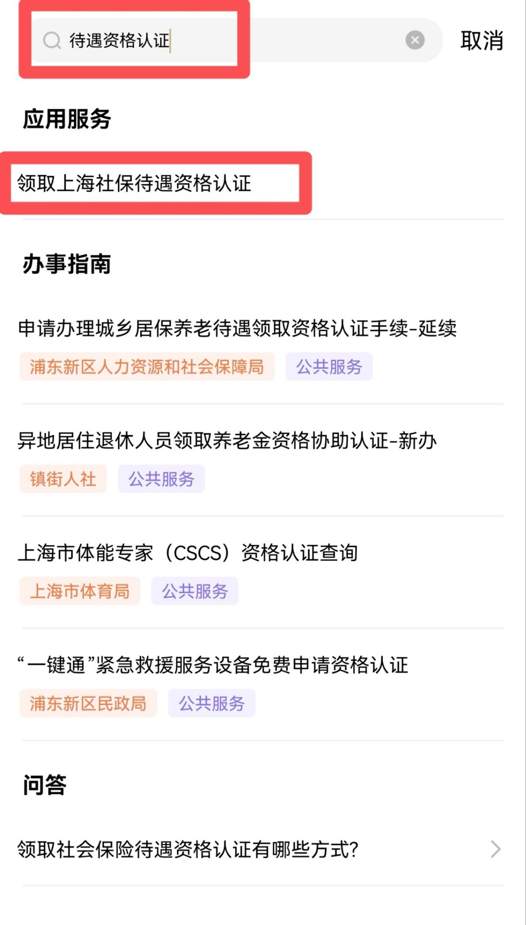 2.搜索“待遇资格认证”,进入“领取上海社保待遇资格认证”专区;