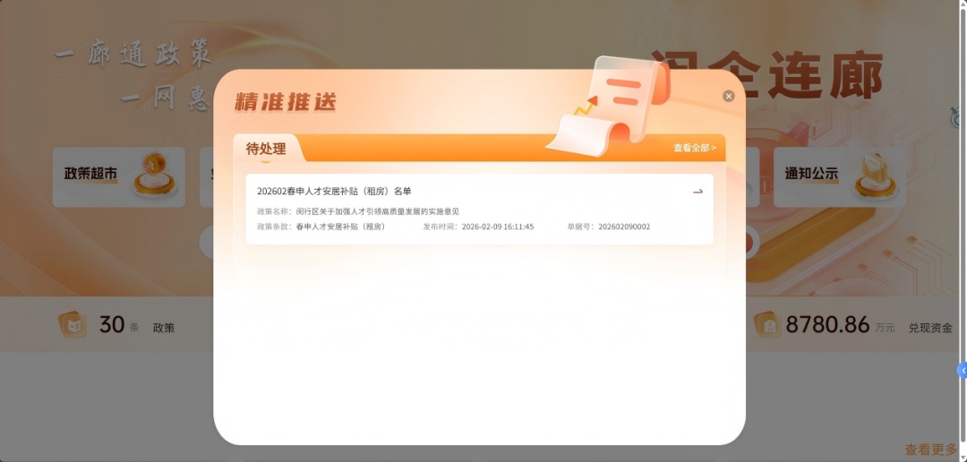 作为这次“先兑后核”创新功能的先行样本,来自区人才局的“2026年闵行区春申人才安居租房补贴”首轮登场,平台直接打通跨部门政务数据共享 “快车道”,利用技术手段给流程“一键瘦身”,将原本让人“眼花缭乱”的申请环节,直接“压缩”为“数据比对、意愿确认、补贴到账”三步走。此外,同步构建起“数据代替材料、算法代替人工、系统代替跑腿”的智能服务体系。这套“硬核组合拳”下来,真正实现“企业免申报、人才零跑腿”,让政策实实在在“丝滑”落地!