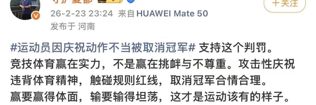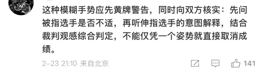 也有网友认为此手势含义模糊,或存文化差异,可以进行罚款/警告等,质疑取消成绩是否处罚过重。