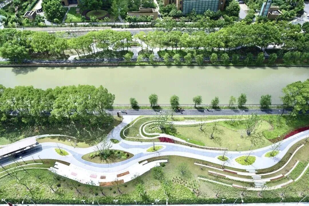 本次休闲路线的西端终点,塘桥公园是张家浜最治愈的一段景致。为让市民更好地享受绿色空间,实现公园和城市无界融合,塘桥公园在2023年实施了拆墙透绿工程。原本单调狭长的挡土墙上“闪现”不同的小动物和植物图案,改善了道路环境,提升了公园城市界面颜值,随手一拍都是江南味。