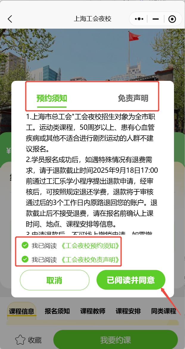 3.点击“我要约课”,完善个人信息,阅读“预约须知”以及“免责声明”内容,点击“已阅读并同意”,按提示正确填写相关报名信息;