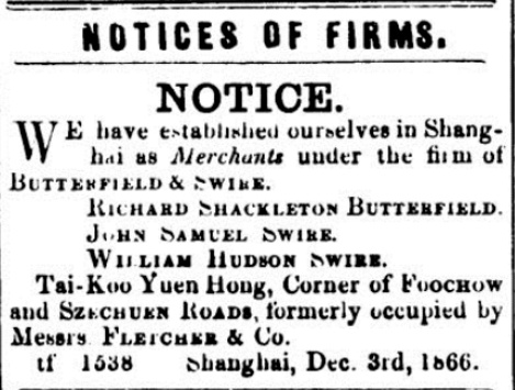 1866年《北华捷报》上太古洋行开业启事