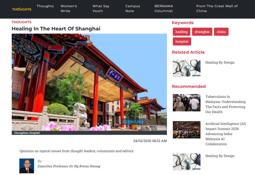 近日,马来西亚马来亚大学荣誉教授、生物医学影像学者黄群雄(Ng Kwan Hoong)参访复旦大学附属中山医院后,撰写了随笔《Healing in the heart of Shanghai》(译:《沪上仁心,疗愈之地》),并被马来西亚国家新闻社Bernama转载。