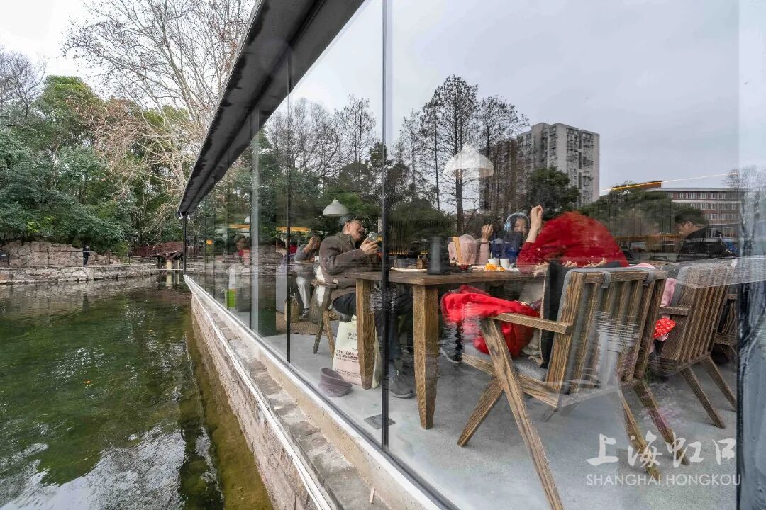 在玻璃房区域,庞女士正和三位好友围坐一处,一边欣赏窗外梅影与湖光,一边轻松交谈。她们对梅园免费开放的惠民举措连连称赞,也对一尺花园舒适雅致的环境十分认可。“我就住在鲁迅公园附近,平时经常过来散步。现在这里开了一尺花园,环境和氛围都特别好。正好我们几位朋友想聚一聚,我就推荐了这里,大家都觉得很满意。”庞女士说道。