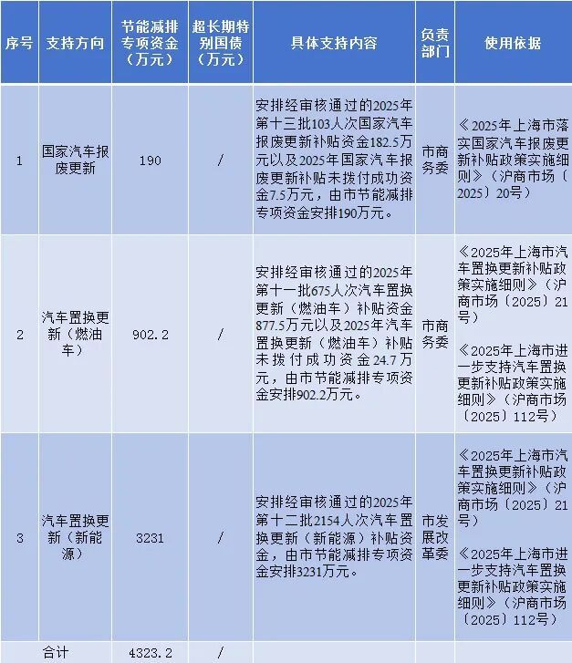 3. 按照《2025年上海市汽车置换更新补贴政策实施细则》(沪商市场〔2025〕21号)、《2025年上海市进一步支持汽车置换更新补贴政策实施细则》(沪商市场〔2025〕112号)规定,安排经审核通过的2025年第十二批2154人次汽车置换更新(新能源)补贴资金,由市节能减排专项资金安排3231万元。