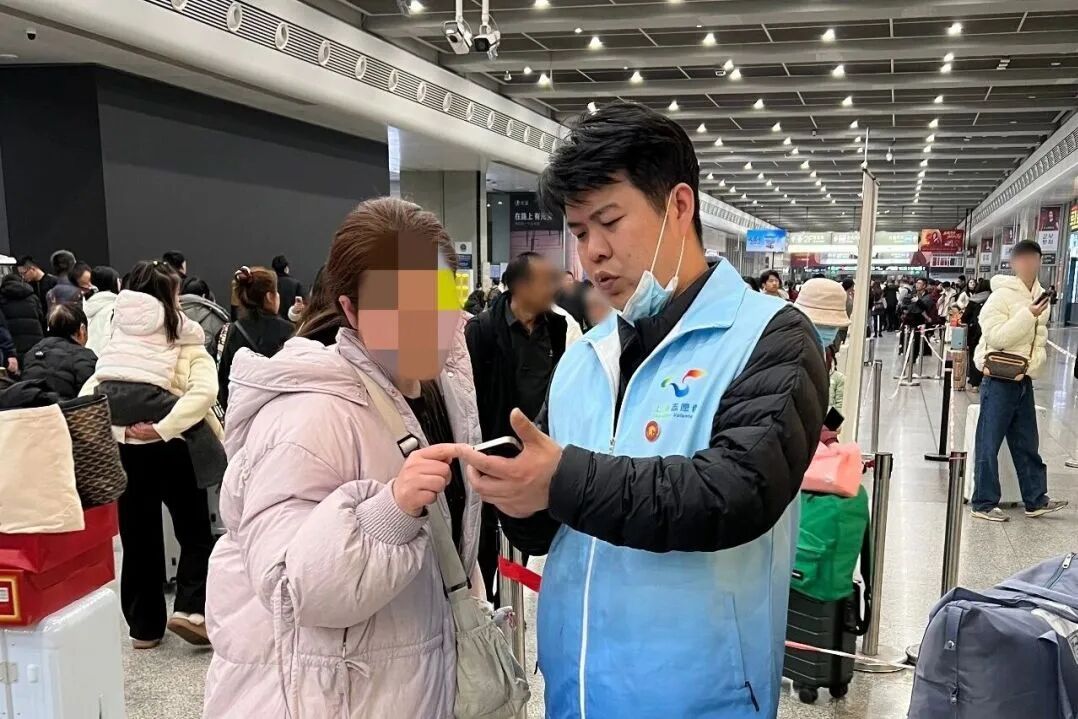 一位满头大汗的大爷背着行李:“我要去浙江,我儿子送我来的,但我手机落在他车里了,想联系他但是不记得他的手机号,这可怎么办?”志愿者缪俊和乔卿快步上前了解情况,安慰道:“大爷您先别急,我们先给您手机打电话,看看能不能联系上您儿子。”一连打了好几个电话但都提示无人接听,志愿者便带大爷去附近的警务室,通过民警帮忙联系这位大爷的亲属。